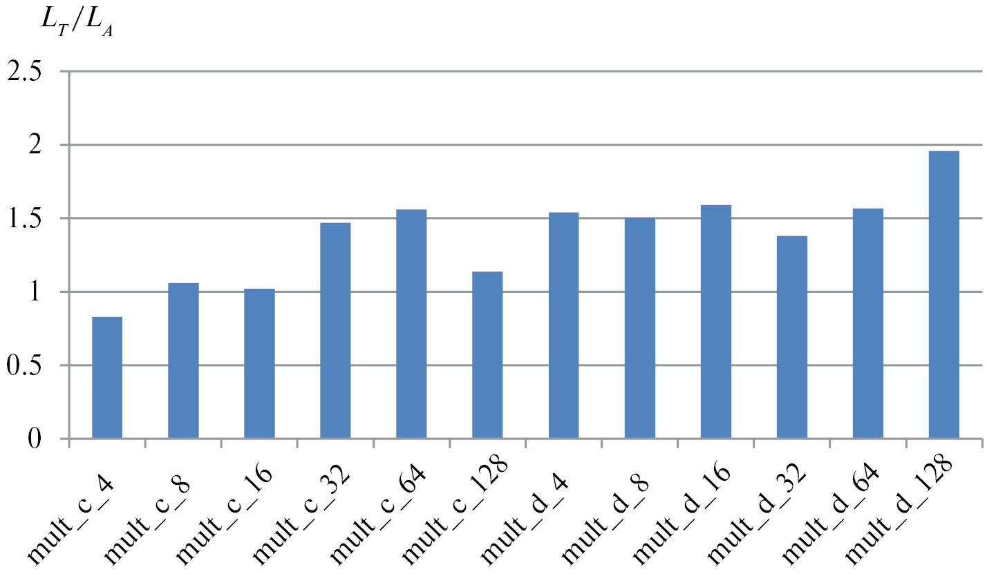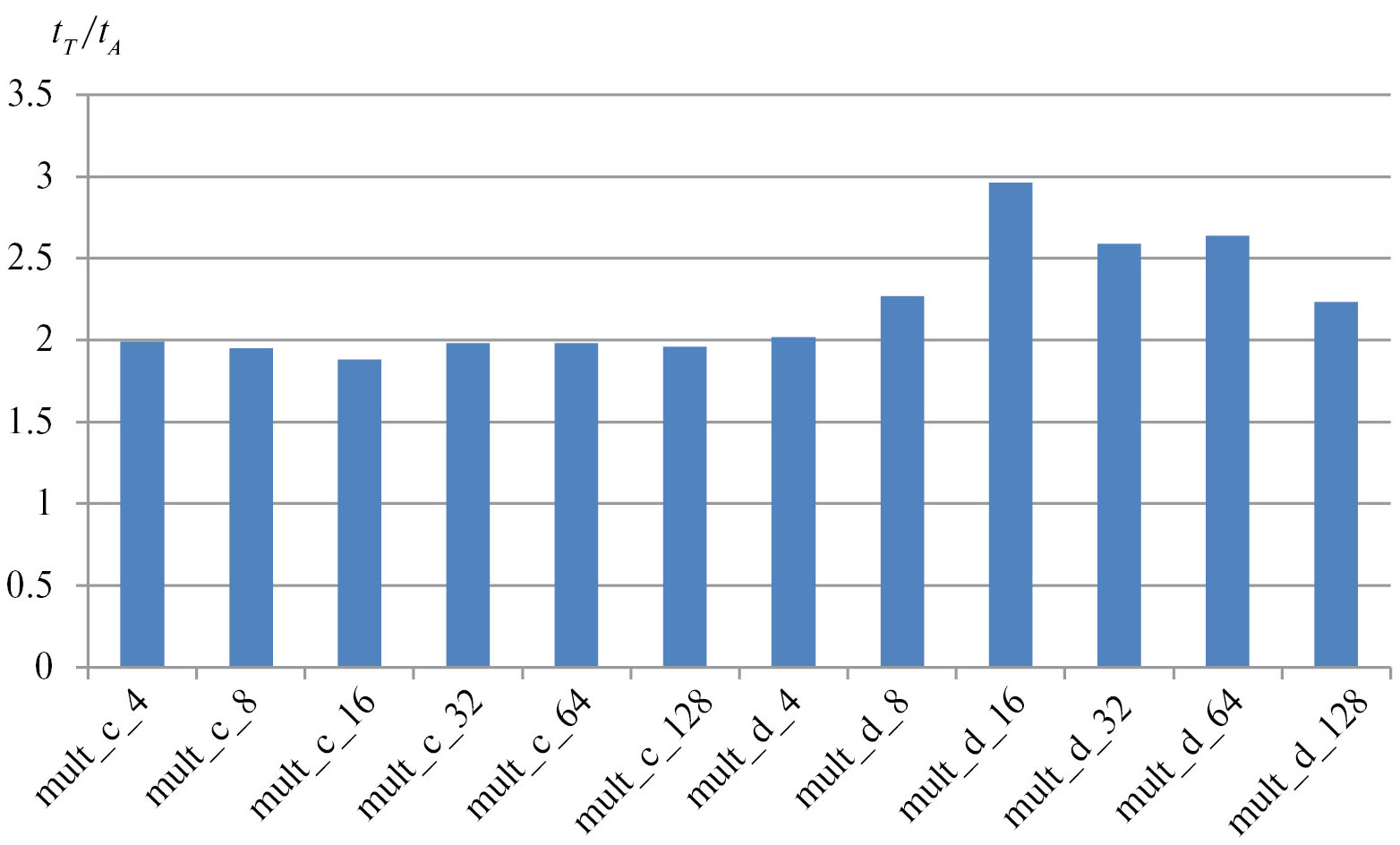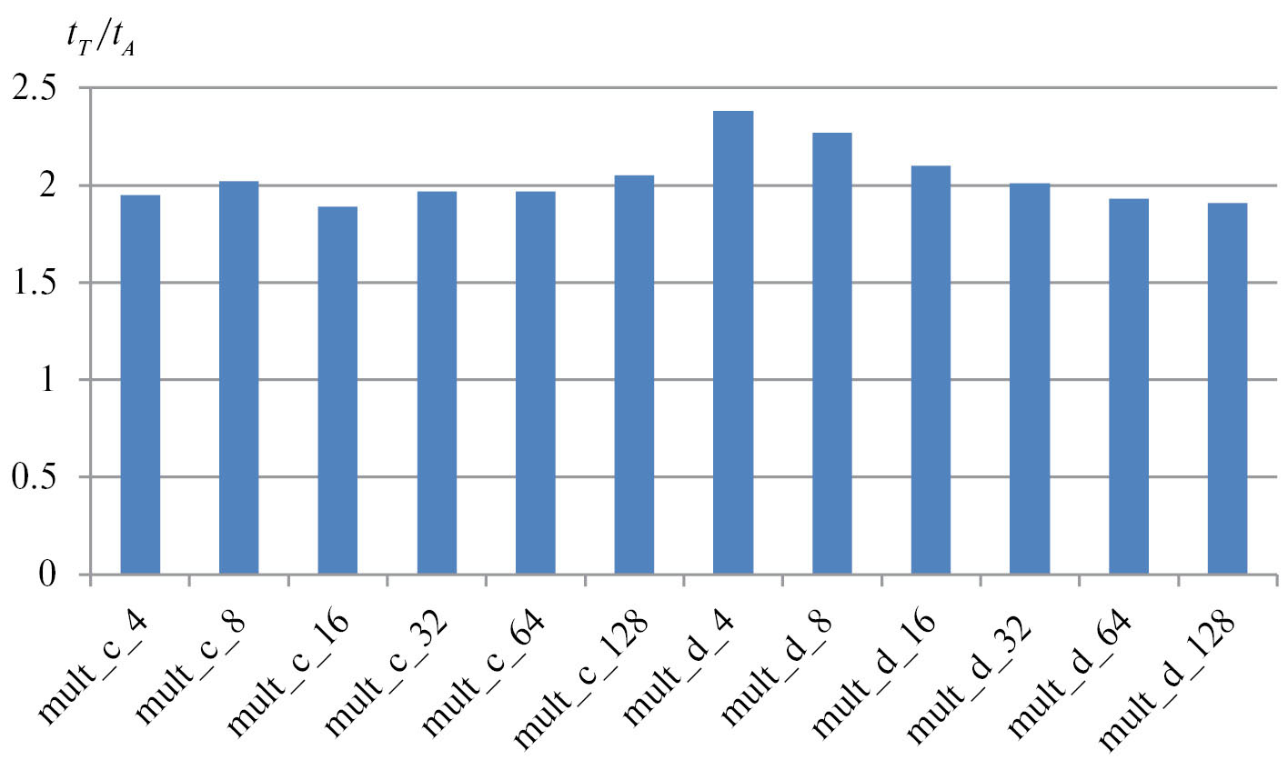 Примечания: mult_c_N и mult_d_N – проекты, реализующие алгоритмы умножения c и d соответственно; N – ширина входных слов умножителей в битах; LT и LA – число используемых логических элементов FPGA (стоимость реализации) в случае традиционного подхода и при использовании методики ASMD-FSMD соответственно; tT и tA – время выполнения операции умножения в наносекундах в случае традиционного подхода и при использовании методики ASMD-FSMD; LT/LA и tT/tA – отношения соответствующих параметров.