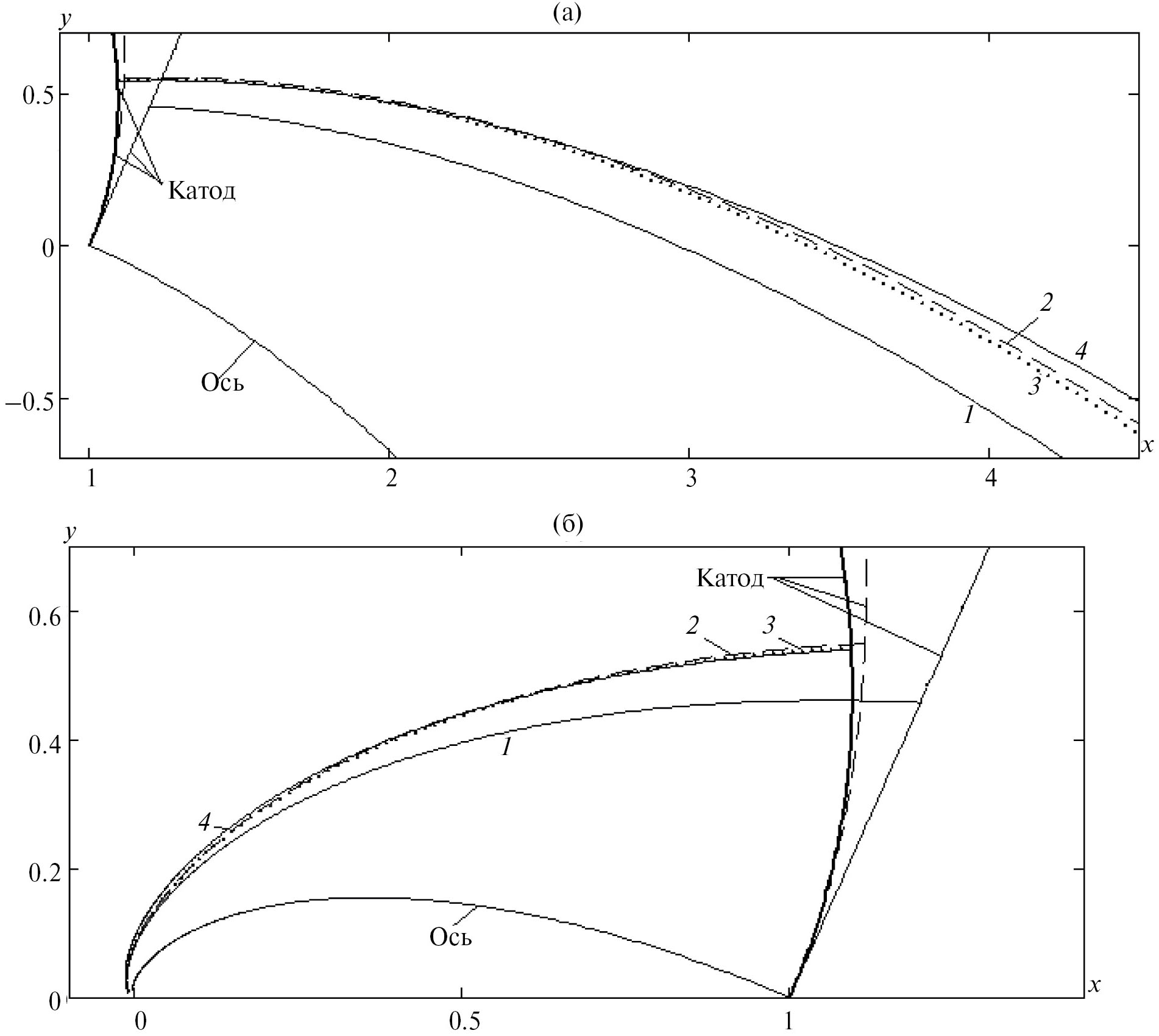 Рис. 2. Граница пучка и форма катода в трёх приближениях (1, 2, 3) l-представления геометризованной теории (4 ‒ точное решение, траектории – спирали), расходящийся поток (а), сходящийся поток (б).
