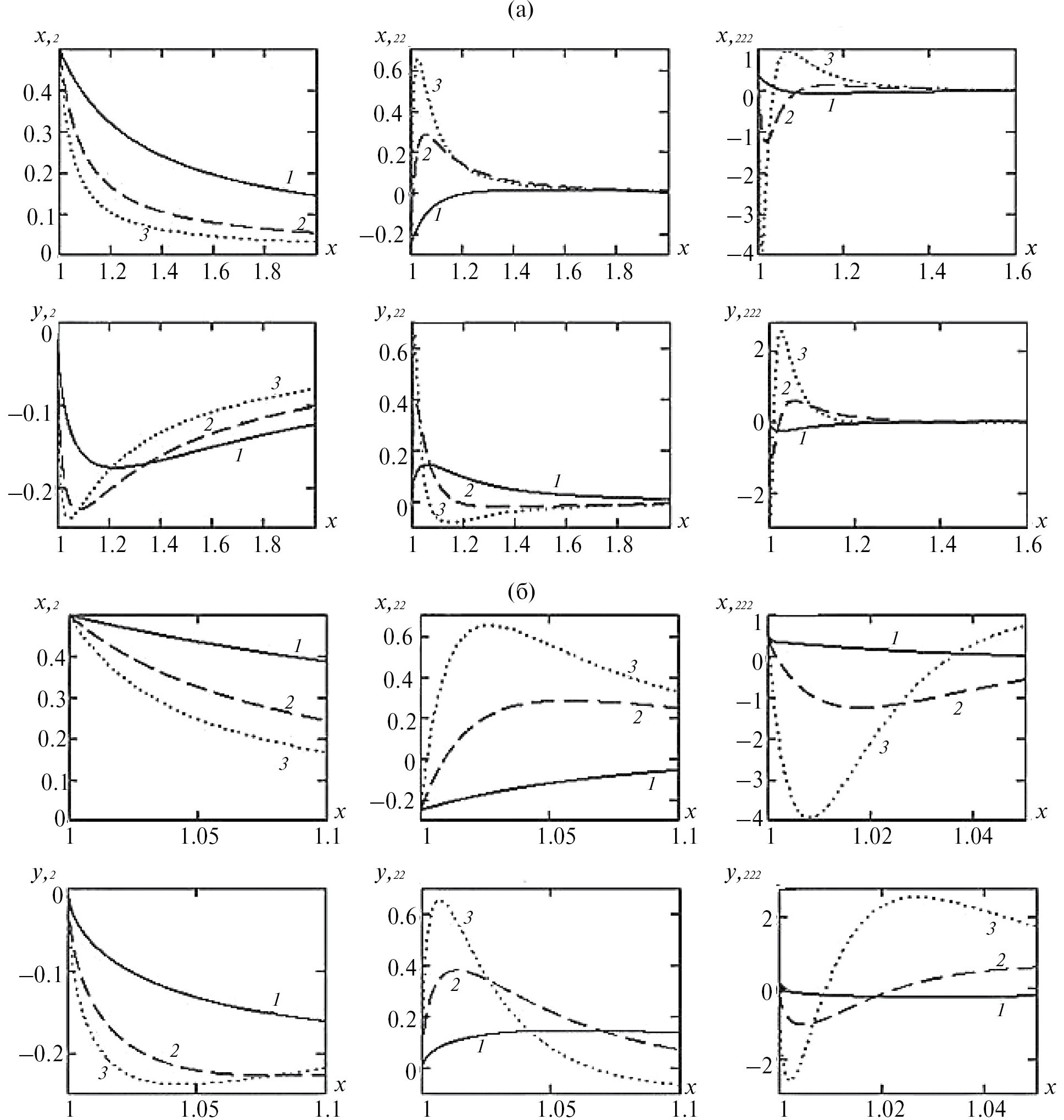 Производные от х, y по поперечной координате для (отношение полуосей ) приведены на рис. 15. При увеличении область резких градиентов все более концентрируется вблизи вершины эллипса с большей кривизной, причем значения производных сильно возрастают. Для () порядок функций , , и , , составляет 2, 10, 60 и 1, 6, 70; для () – 3, 70, 1600 и 2, 20, 2500. На рис. 16 приведены характеристики параметров потока при , , , где , а также величины с индексами exa соответствуют вершине с большей кривизной. Числовую информацию для этого случая и для , , ; , , содержат табл. 12–14.
