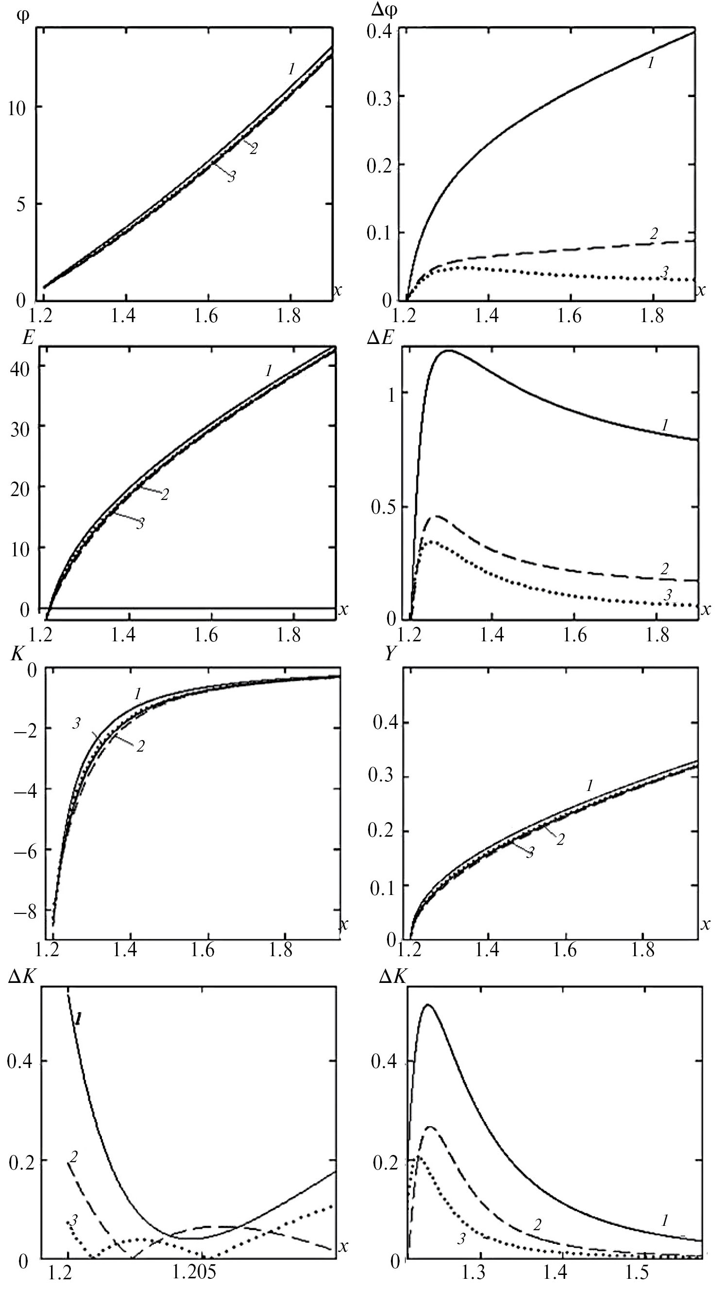 Из табл. 9, 10 видно, что ошибка вычисления φ, E, k при использовании ортогональных координат составляет 4, 35 и 20 %, а в неортогональном варианте – 1, 7 и 3 %. Обратим внимание на тот факт, что начальная ширина пучка 0.2 равна радиусу кривизны оси в точке старта, поэтому он не может считаться узким.
