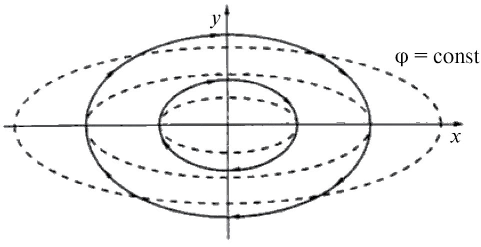 Эталонное решение с эллиптическими орбитами частиц (рис. 14) в однородном магнитном поле [23], как и решение с гиперболическими траекториями, позволяет рассмотреть течение с большой кривизной оси в плоскости инжекции и с еще бòльшими значениями ее производной, т.е. задачу с высокими градиентами параметров, особенно сложную для приближенных моделей. Геометризованное описание возможно только в l-варианте теории: φ-представление не работает по той же причине, которая была названа в разд. 3, 4, а в W-варианте возникает сингулярная прямая , на которой производные от х, y по x1, x2 обращаются в бесконечность.