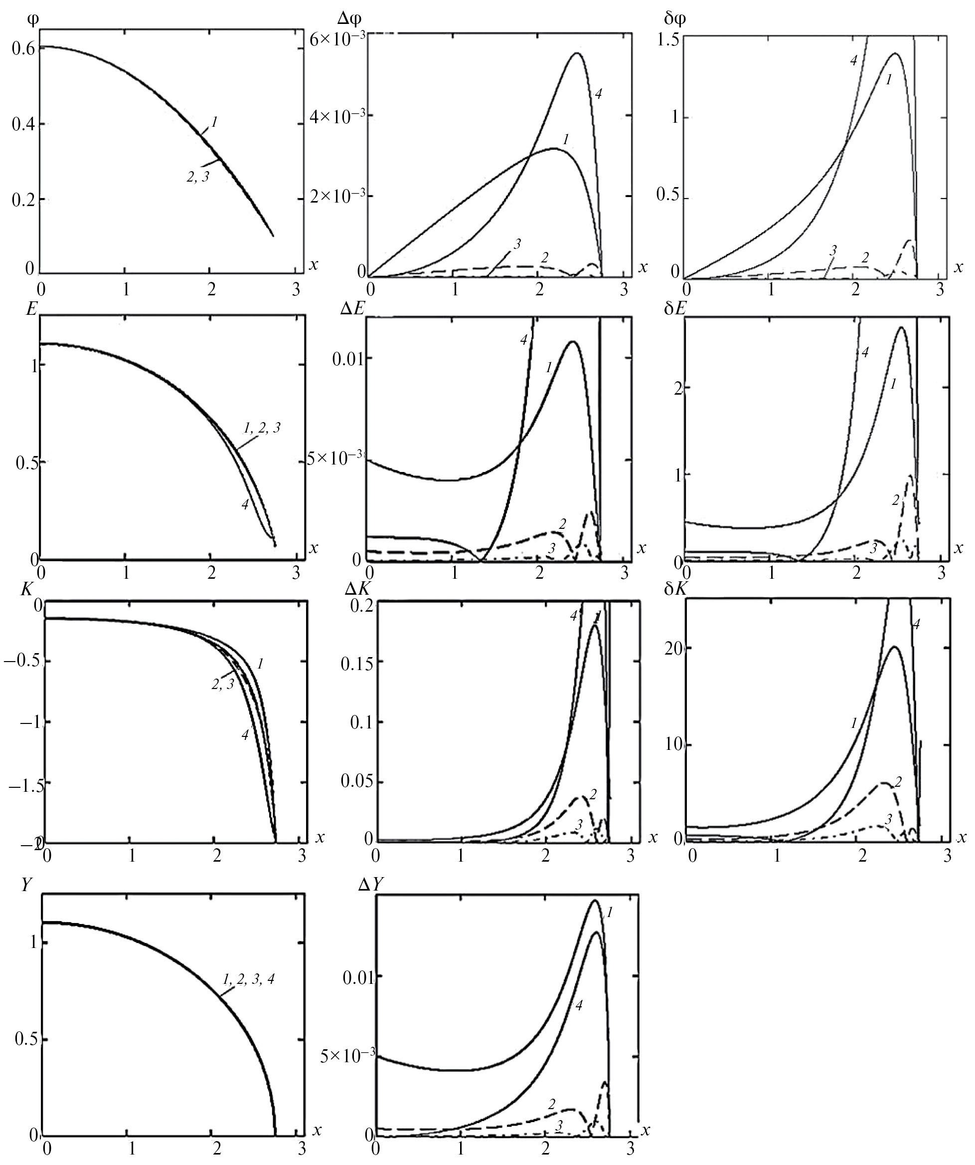 Значения , и относительной ошибки приведены в табл. 3 для . Радиус кривизны катода на базовой поверхности равен 1.09, а расстояние между верхней и нижней кромками пучка составляет 0.971 и имеет тот же порядок величины при перепаде плотности тока . Пучок с такими параметрами является существенно непараксиальным и рассчитывается с ошибкой 0.15 %.