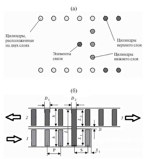 Переход представляет собой двухслойную структуру (рис. 1), в которой набегающая волна EBG-волновода, расположенного на нижнем слое, переходит на верхний слой с использованием вертикального металлического зонда и отверстия связи в металлической стенке удвоенной толщины, разделяющей оба слоя. На верхнем слое мощность волны делится на два канала, каждый из которых представляет собой EBG-волновод такой же, как и на нижнем слое. Таким образом, исследуемая структура выполняет две функции: функцию межслойного перехода и функцию деления мощности на два канала. Данное устройство является двухслойным трехпортовым СВЧ-устройством (цифры на рисунке обозначают номера портов). Период кристалла, в котором сформированы волноводы на каждом слое, и, соответственно, период цилиндров в стенках волноводов обозначим P, диаметр цилиндров в стенках D1. Толщина ПВ на каждом слое h. Расстояние между зондом и поперечным рядом цилиндров, который служит коротким замыканием (КЗ) для EBG-волновода на нижнем слое, обозначим S. Расстояние S1 между КЗ волновода и закрытым торцом ПВ полагаем равным P/2. Глубина погружения зонда в нижний слой L1, в верхний слой L2, общая длина зонда L = L1 + L2 + 2t, где t — толщина стенки волновода. Обозначим диаметр зонда D2, диаметр отверстия связи в широких стенках стыкуемых волноводов D3 (на рис. 1, 2 размер D3 не показан).