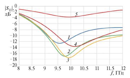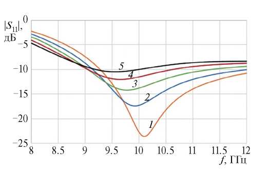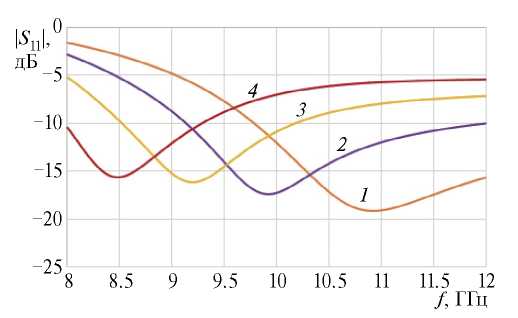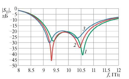 Графики на рис. 3–5 свидетельствуют о том, что частота минимума коэффициента отражения, определяемая резонансной частотой области перехода, зависит от обоих параметров N и L1, в то время как длина зонда на верхнем слое L2 влияет в основном на уровень согласования. Из сопоставления рис. 3–5 следует, что наилучшим сочетанием параметров по критерию ширины полосы согласования перехода является N = 0.7 (рис. 3, кривая 2), L1 = 6.5 (рис. 4, кривая 2), L2 = 8 (рис. 5, кривая 3). Значению N = 0.7 соответствуют значения S = 4.2, S+S1 = 7.2. Однако даже в этом случае уровень согласования перехода лучше чем –10 дБ достигается с частоты немного выше 9 ГГц, т. е. такой переход является более узкополосным по сравнения с переходом в [14], в котором отмеченный уровень согласования достигается во всем диапазоне частот 8…12 ГГц.