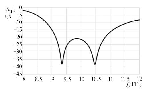 В качестве оптимального значения выбираем Mx = 3.075, при котором кривая согласования имеет достаточно симметричную форму и два практически одинаковых по величине разнесенных по частоте минимума (рис. 9). Этому значению Mx соответствует длина Lx = PMx = 18.45 и расстояние между согласующими стержнями 2Lx = 36.9. Для перехода с такими параметрами относительные полосы частот по уровням согласования –10, –15 и –20 дБ составляют соответственно 28 %, 21 % и 17 %.