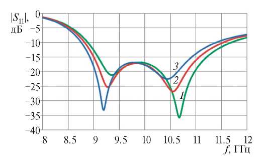 В дополнение на рис. 11 представлены зависимости коэффициента отражения для разных значений величины L1, характеризующей длину зонда на нижнем слое, при фиксированных других параметрах, а на рис. 12 показан коэффициент отражения для разных значений величины L2 — длины зонда на верхнем слое при фиксированных других параметрах. Из рис. 10–12 видно, что значения N = 0.7, L1 = 6.5 и L2 = 8, которым соответствуют кривые 2 на этих рисунках, можем считать оптимальными по критерию наилучшего и сбалансированного согласования в центральной части диапазона от 9 до 11 ГГц. В данном случае критерием сбалансированности согласования может служить достаточно симметричная форма кривой и ширина полосы согласования по уровню –20 дБ.