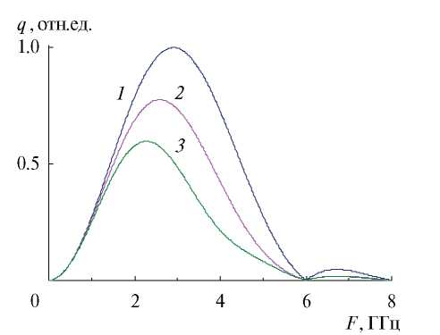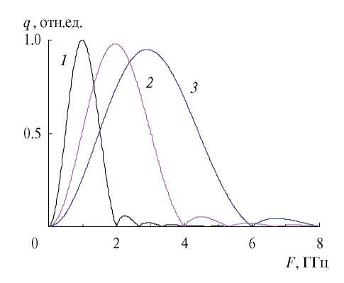На рис. 3 показано распределение плотности частотного спектра q(F) импульса излучения при возбуждении рупора импульсом моноцикла U(t) с фиксированной амплитудой, но при разной длительности фронта перепада напряжения — 100, 150 и 300 пс.