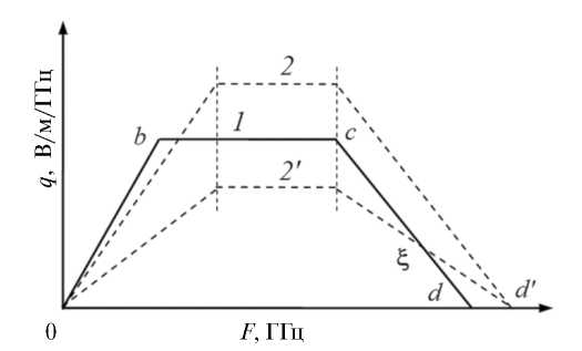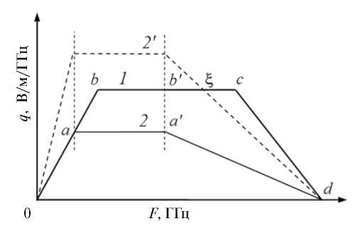 Пусть ЭТС располагается по оси ДН антенны излучателя (φ = 0). Пусть при фиксированной частоте f0 на расстоянии Rп от излучателя наблюдается отказ нормального функционирования ЭТС в соответствии с заданным критерием результата воздействия (подавление, поражение). Это означает, что в какой-то точке на распределении плотности частотного спектра единичного импульса излучения q1(F, Rп, φ = 0) достигнуто пороговое значение параметров воздействия. Назовем эту точку (qп , Fп) критической, а распределение q1 представим в виде кусочно-ломаной линии 1 (0bcd на рис. 5). Рассмотрим способ определения положения точки (qп , Fп) на зависимости q1(F, Rп, φ = 0).
