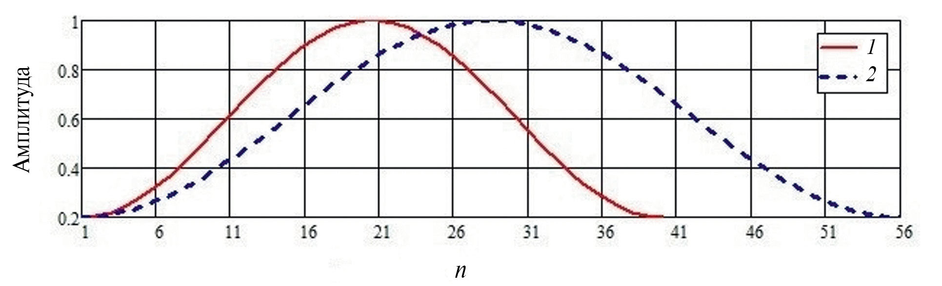 На рис. 1 и 2 построены графики реализуемых амплитудных распределений, в зависимости от порядкового номера излучающего элемента n в азимутальной и угломестной плоскостях.