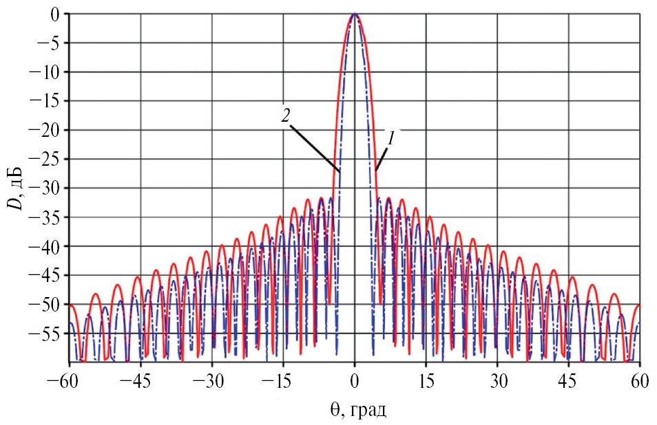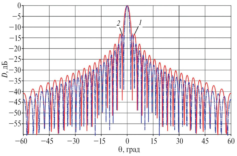 Рис. 9. Диаграмма направленности с равномерным распределением и амплитудно-фазовыми ошибками: 1 – азимутальная плоскость; 2 – угломестная плоскость.