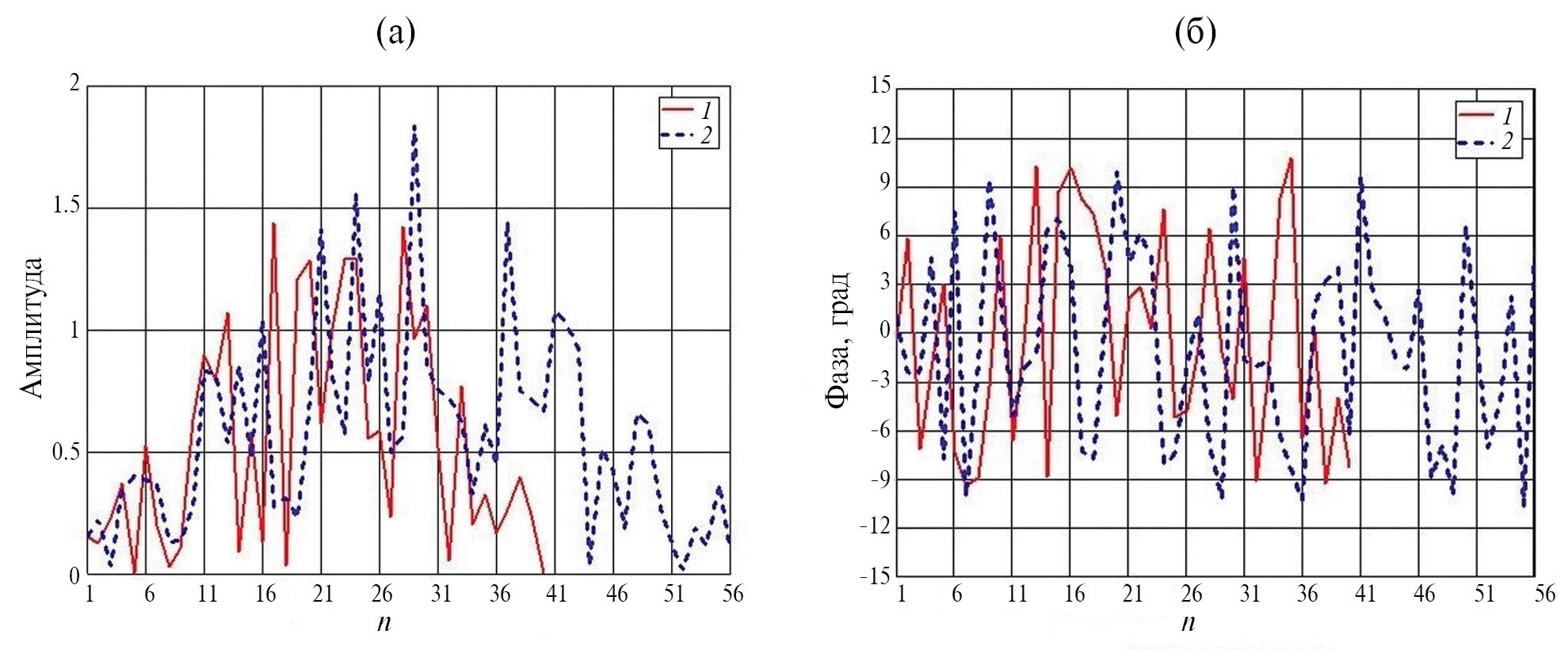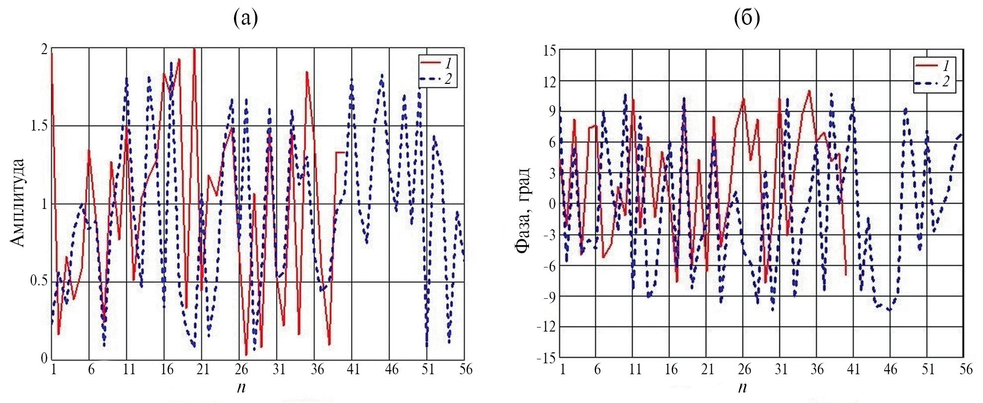 Рис. 7. Равномерные амлитудное (а) и фазовое (б) распределения с ошибками: 1 – азимутальная плоскость; 2 – угломестная плоскость.
