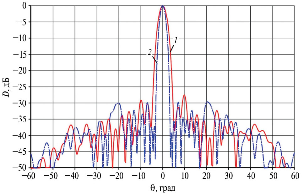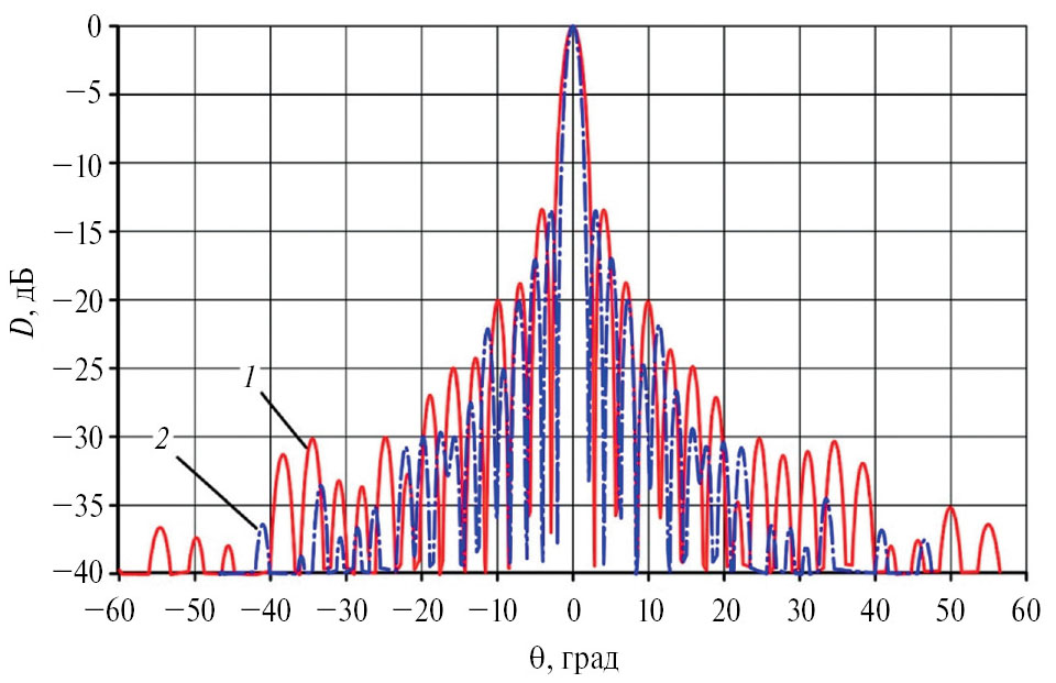Исходя из размеров рассматриваемой апертуры АР была построена теоретическая ДН для равномерного распределения (рис. 5). Видно, что уровень первых боковых лепестков не менее 13 дБ в обеих плоскостях, ширина ДН в азимутальной и угломестной плоскостях 2.5° и 1.8°, КНД не менее 38.6 дБ.