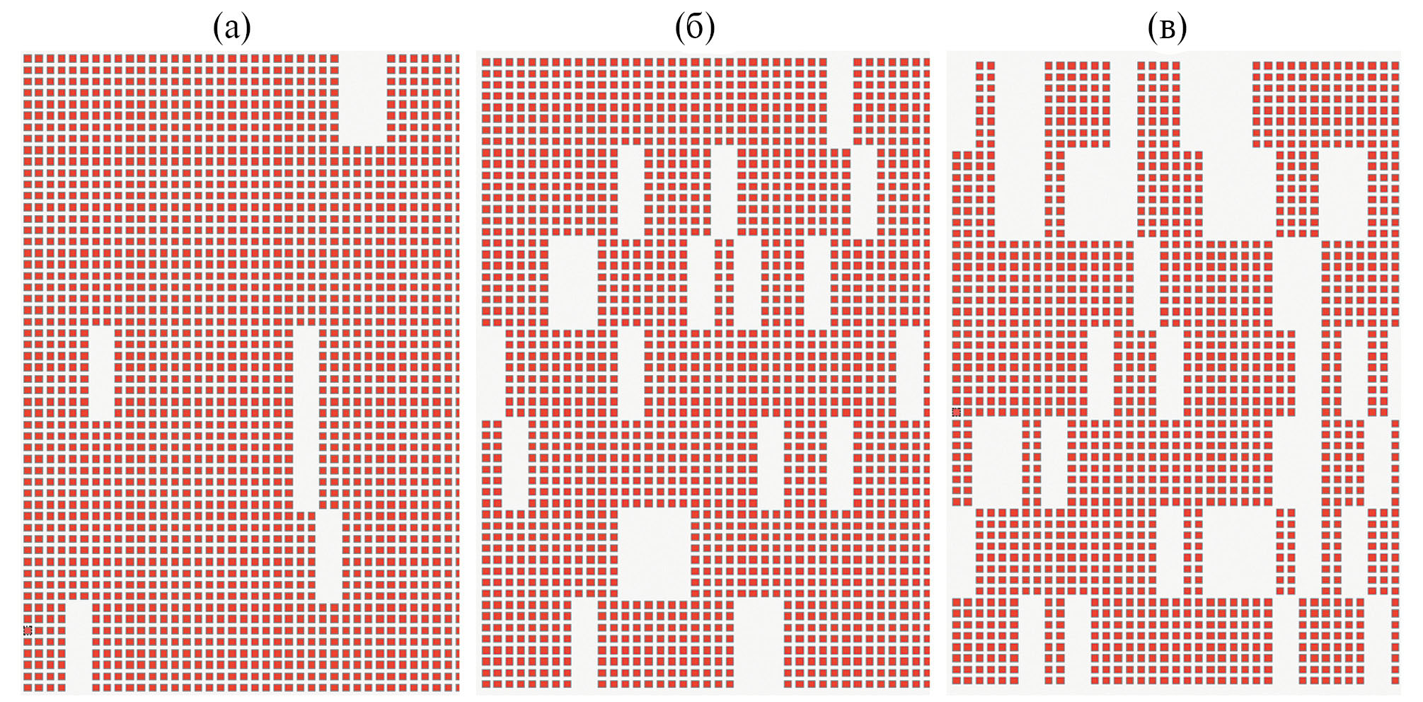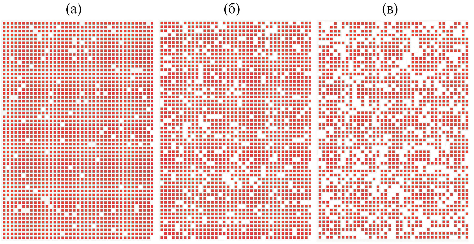 Рис. 11. Апертура АР с вышедшими из строя излучающими каналами: 5% (а), 15% (б) и 30% (в).