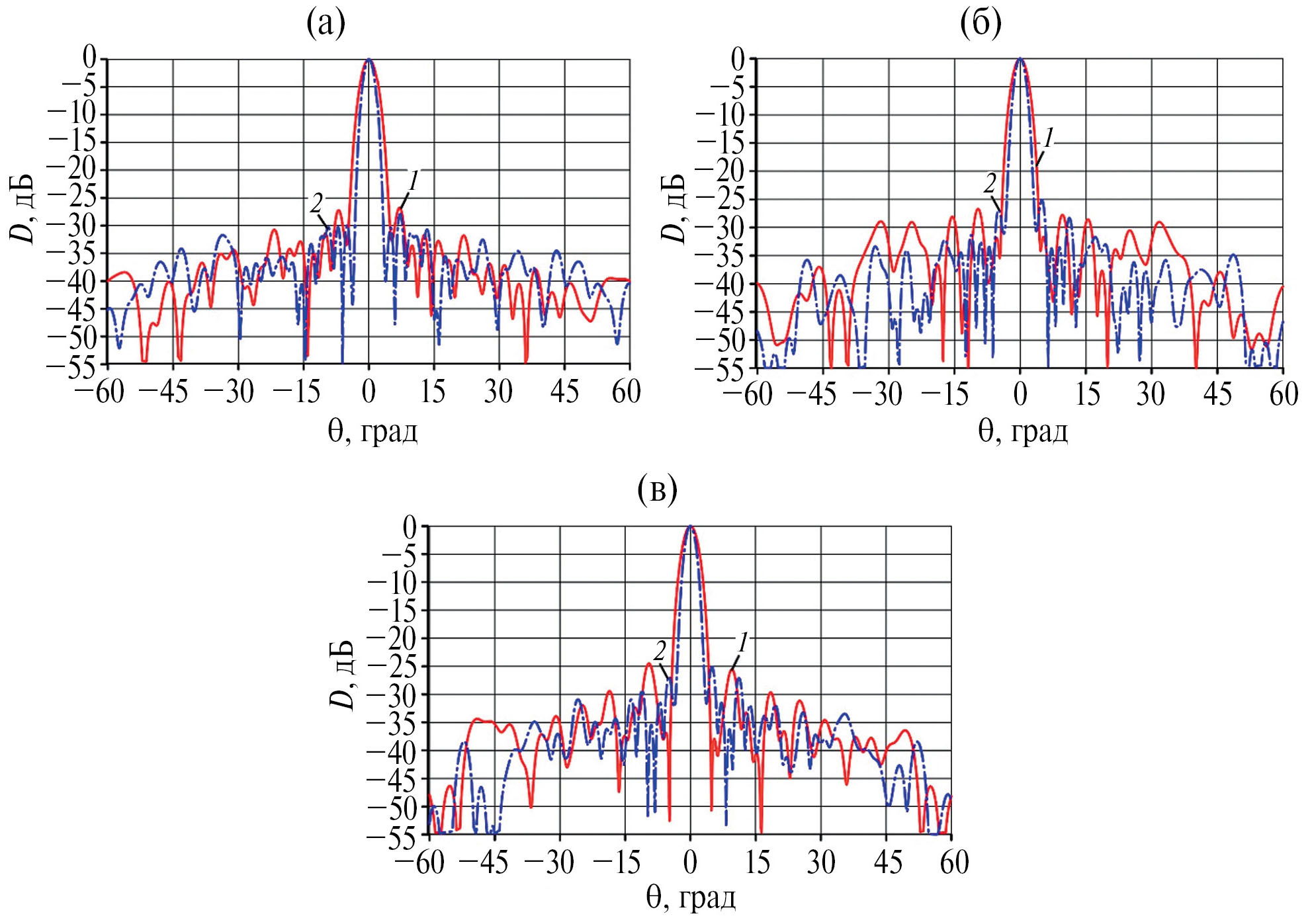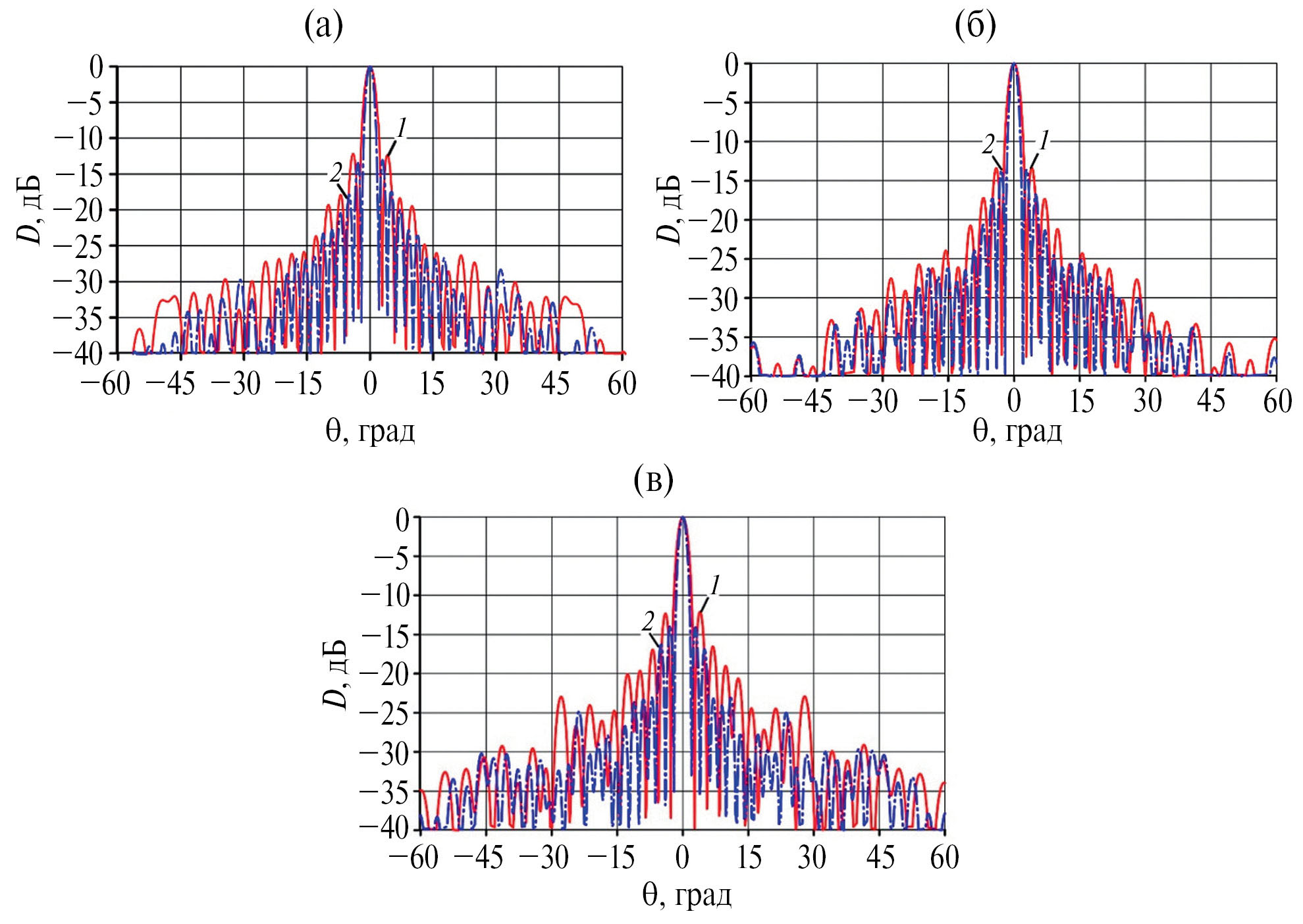Рис. 17. Диаграмма направленности с распределением cos2 на пьедестале 0.2 и 5% (а), 15% (б), 30% (в) вышедшими из строя модулями: 1 – азимутальная плоскость; 2 – угломестная плоскость.