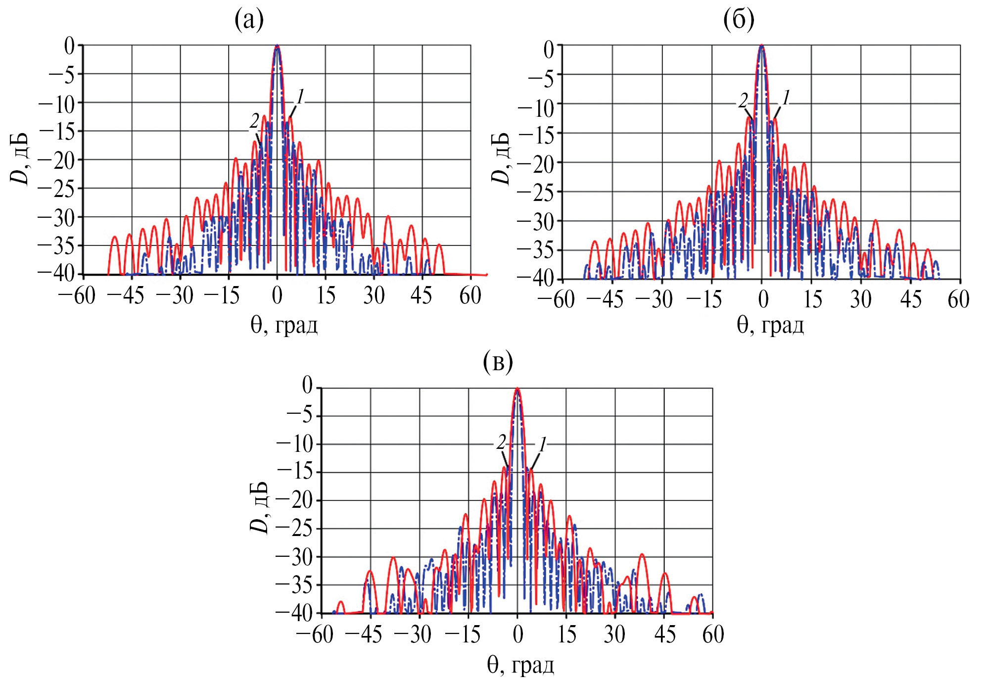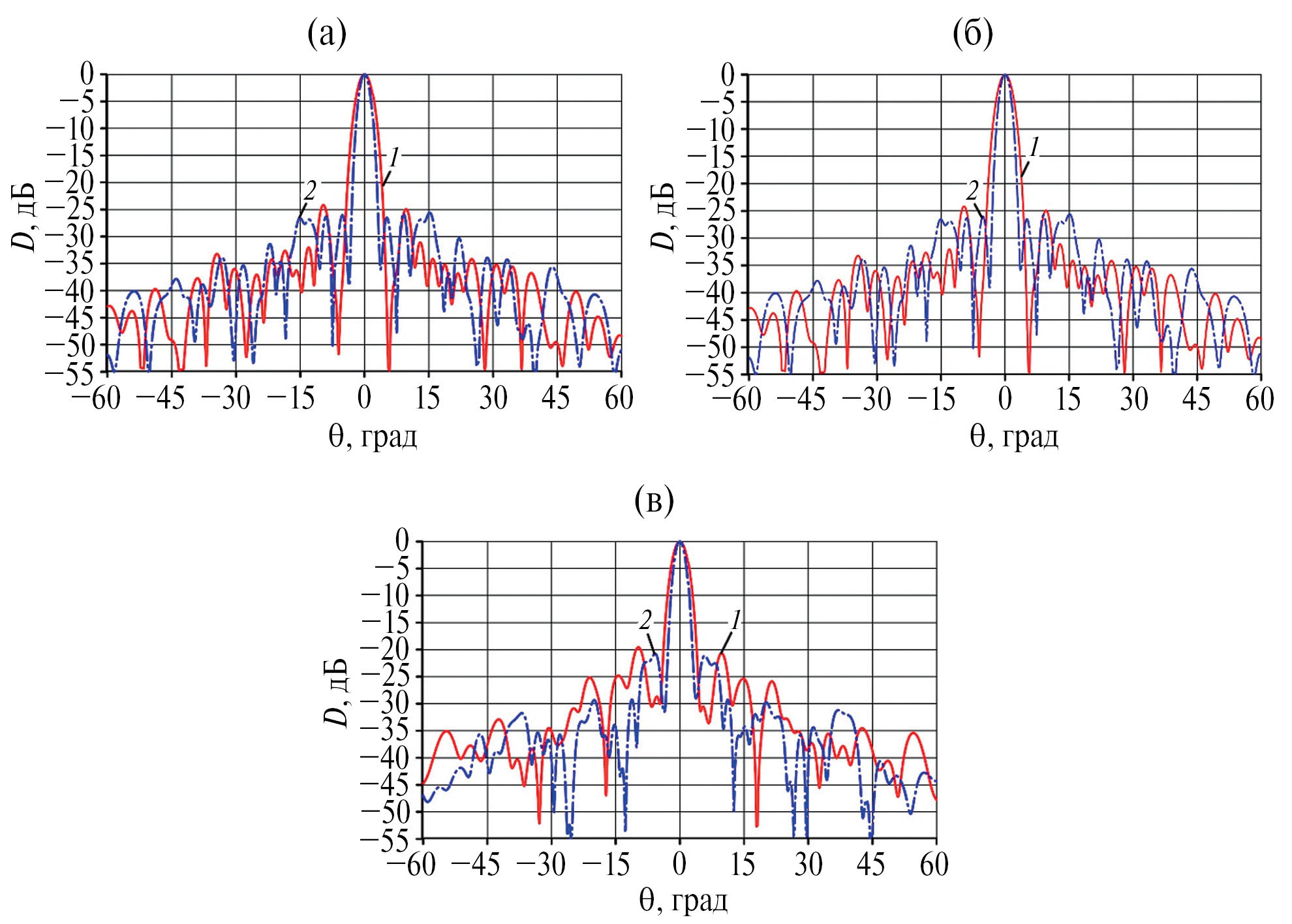 Рис. 12. Диаграмма направленности с равномерным распределением и 5% (а), 15% (б), 30% (в) вышедшими из строя излучающими каналами: 1 – азимутальная плоскость; 2 – угломестная плоскость.