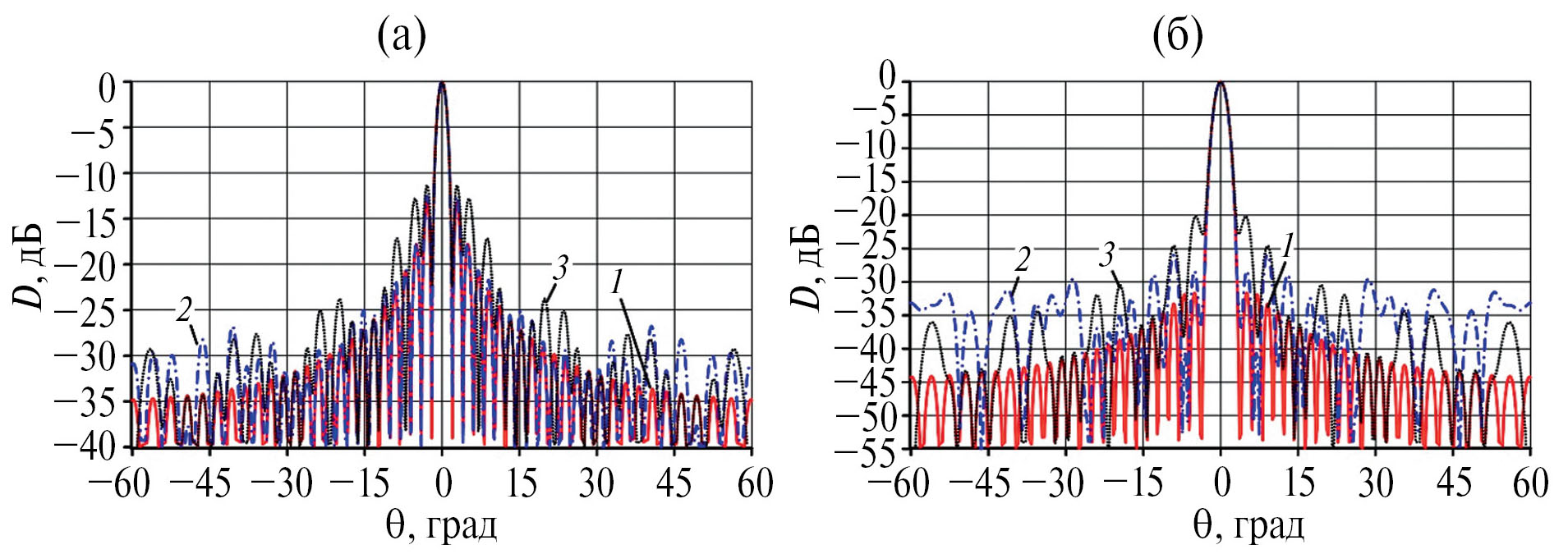Рис. 16. Диаграмма направленности без амплитудно-фазовых ошибок с равномерным распределением (а) и распределением cos2 на пьедестале 0.2 (б): 1 – теоретическая, 2 – с вышедшими из строя каналами, 3 – с вышедшими из строя модулями.
