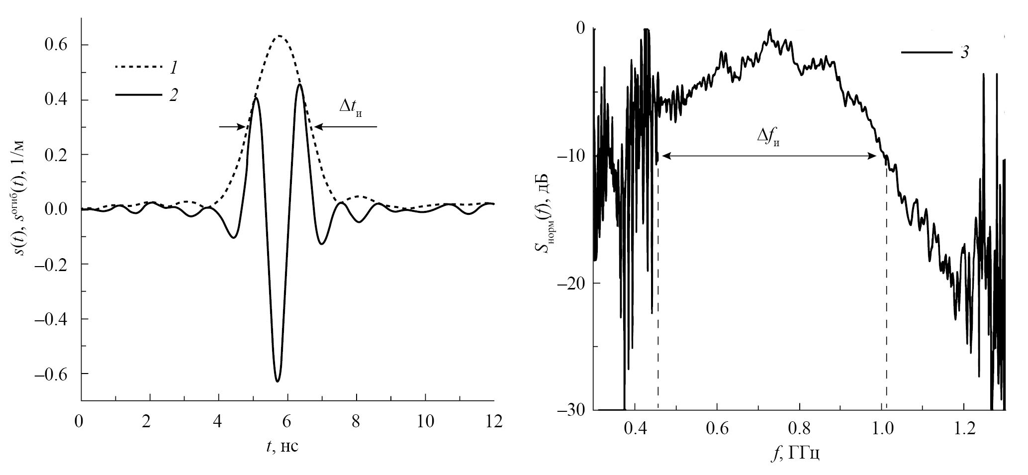 – нормировочная константа, необходимая для учета спектра оконной функции Kα(f). Синтезированный с использованием оконной функции Гаусса Kα(f) = exp(–0.5[(f — f0)/α]2) импульс оказался длительностью ∆tи = 1.8 нс (по уровню половинной амплитуды) с шириной спектра ∆fи = 558 МГц (по уровню –10 дБ) от 456 до 1014 МГц и со средней частотой f0 = 731 МГц. Ширина полосы пропускания оконной функции Гаусса Kα(f) задавалась порядка 1 ГГц (по уровню –6 дБ) с α = (4π)–1. Форма синтезированного СШП-импульса и его спектр при отражении от латунной сетки показаны на рис. 4.