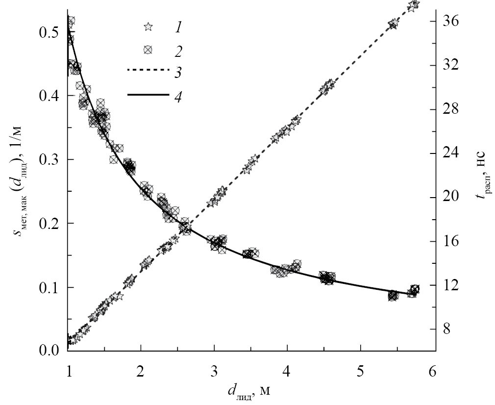 Рис. 5. Время распространения tрасп (1) и максимум огибающей sмет,мак(dлид) (2), синтезированного СШП-импульса, отраженного от металлического экрана (латунной сетки), при различной высоте dлид положения фазового центра антенны над экраном. Аппроксимирующие зависимости и соответствующие R2 и СКО: кривая 3 — tрасп = (0.18 ± 0.03)+(6.54 ± 0.01) dлид, R2 = 0.999 и СКО = 0.15 нс; кривая 4 — sмет, max(dлид) = (1.017 ± 4.910–3)/(2dлид), R2 = 0.986 и СКО = 0.014 м–1.