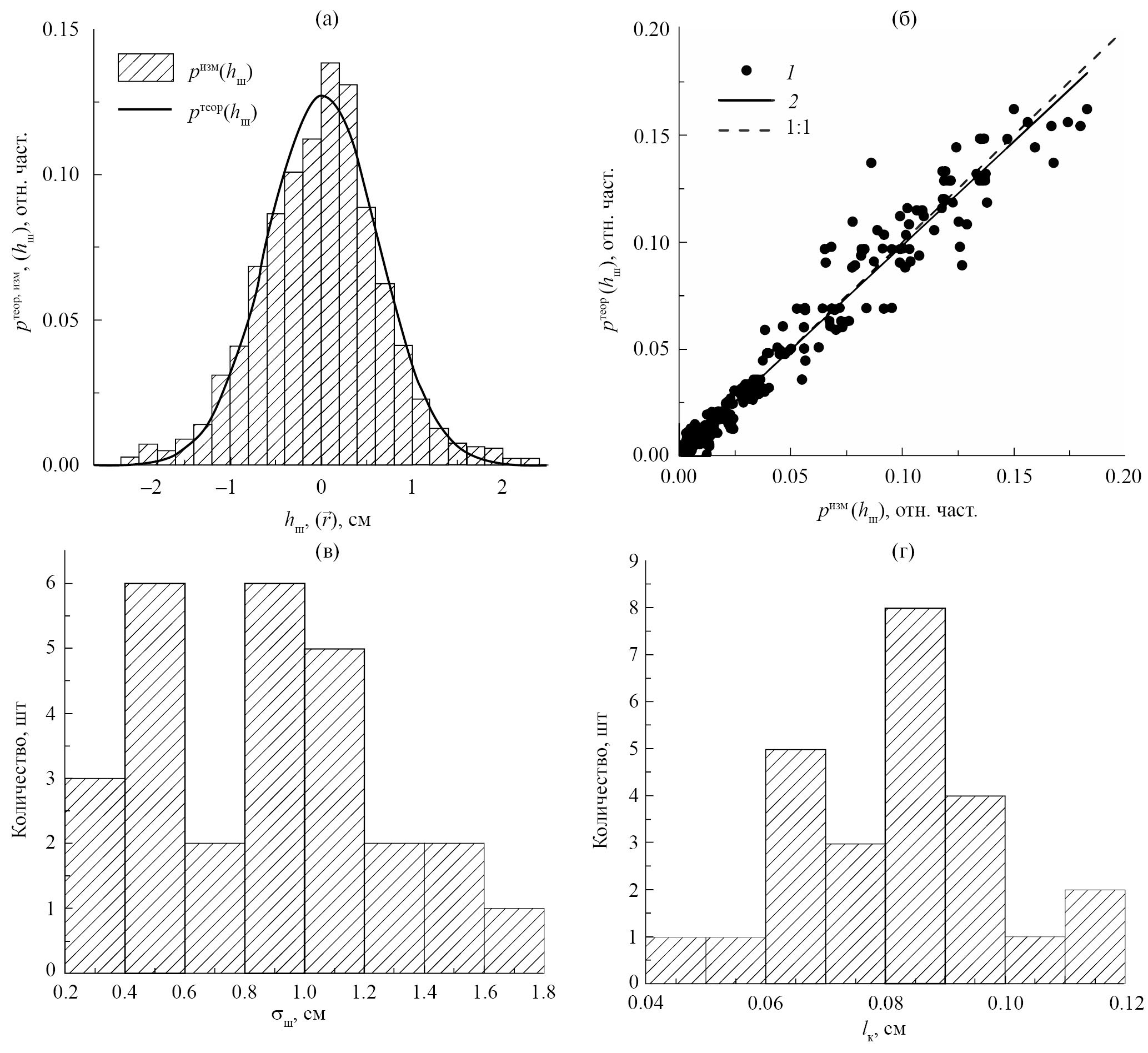 Рис. 6. Характеристики мелкомасштабных неровностей поверхности почвы тестовых участков: а) распределение высот неровностей hш, поверхности почвы pизм(hш), измеренных фотограмметрическим методом 21.09.2022 на тестовом участке 2, площадка 1, при R2 = 0.981; pтеор(hш) – соответствующая аппроксимация гауссовой функцией; б) корреляция между измеренными и аппроксимированными (гауссова функция) распределениями hш для всех тестовых участков в ходе всех экспериментов (1), линейная регрессия (2), при R2 = 0.964; в, г) распределение измеренных фотограмметрическим методом СКО σш и длины корреляции lк высот мелкомасштабных неровностей поверхности почв в целом для всех тестовых участков в ходе всех экспериментов.