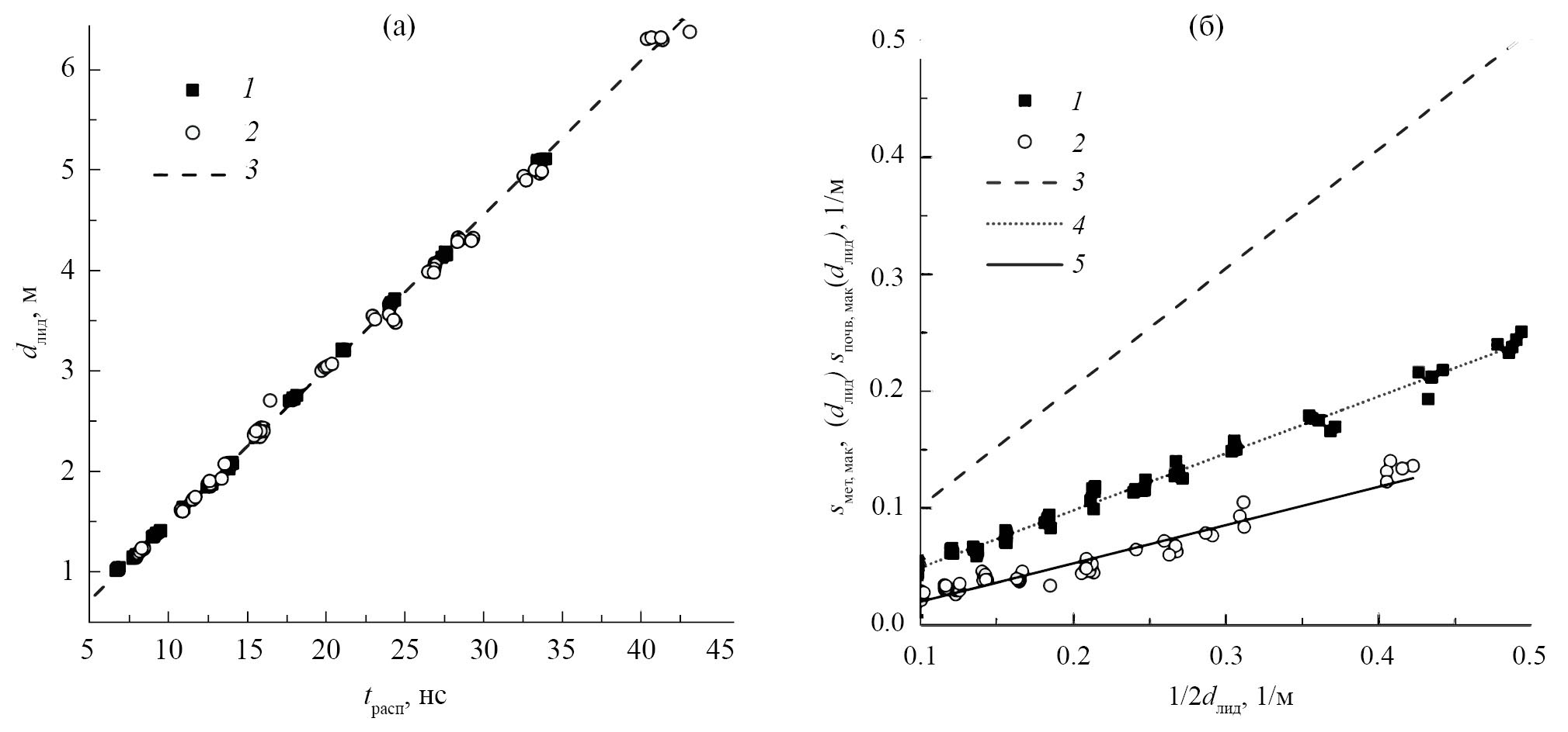 Рис. 9. Время запаздывания (а) и максимумы огибающих (б) СШП-импульсов, отраженных от почвенного покрова: а – измерения выполнены 11 и 17 сентября 2022 г. на тестовом участке 1 соответственно на площадках 1 (1) и 2 (2); б — аппроксимации измеренных значений sпоч, max(dлид) (символы 1 и 2) линейными зависимостями обозначены соответственно 4 и 5. Линейные зависимости 3 получены в ходе калибровки (см. разд. 3Б).
