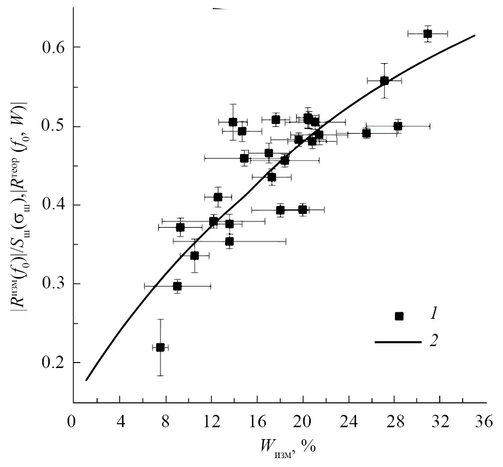 В. В соответствии с методикой расчета модуля коэффициента отражения по наклону линейных зависимостей (см. рис. 9б и формулу (3)) были найдены модули коэффициентов отражения для всех тестовых площадок в ходе всех экспериментов. На рис. 10 приведены зависимости экспериментально измеренных модулей коэффициентов отражения (нормированных на фактор шероховатости Sш(ш)) от объемной влажности почвы, измеренной на тестовых участках. На рис. 10 отрезками отмечены интервалы СКО в определении коэффициентов отражения по линейным зависимостям (рис. 9б) и СКО объемной влажности почвы, измеренной на каждой из тестовых площадок. Наблюдаемая влажностная зависимость модуля коэффициента отражения (рис. 10), хорошо описывается следующей моделью: