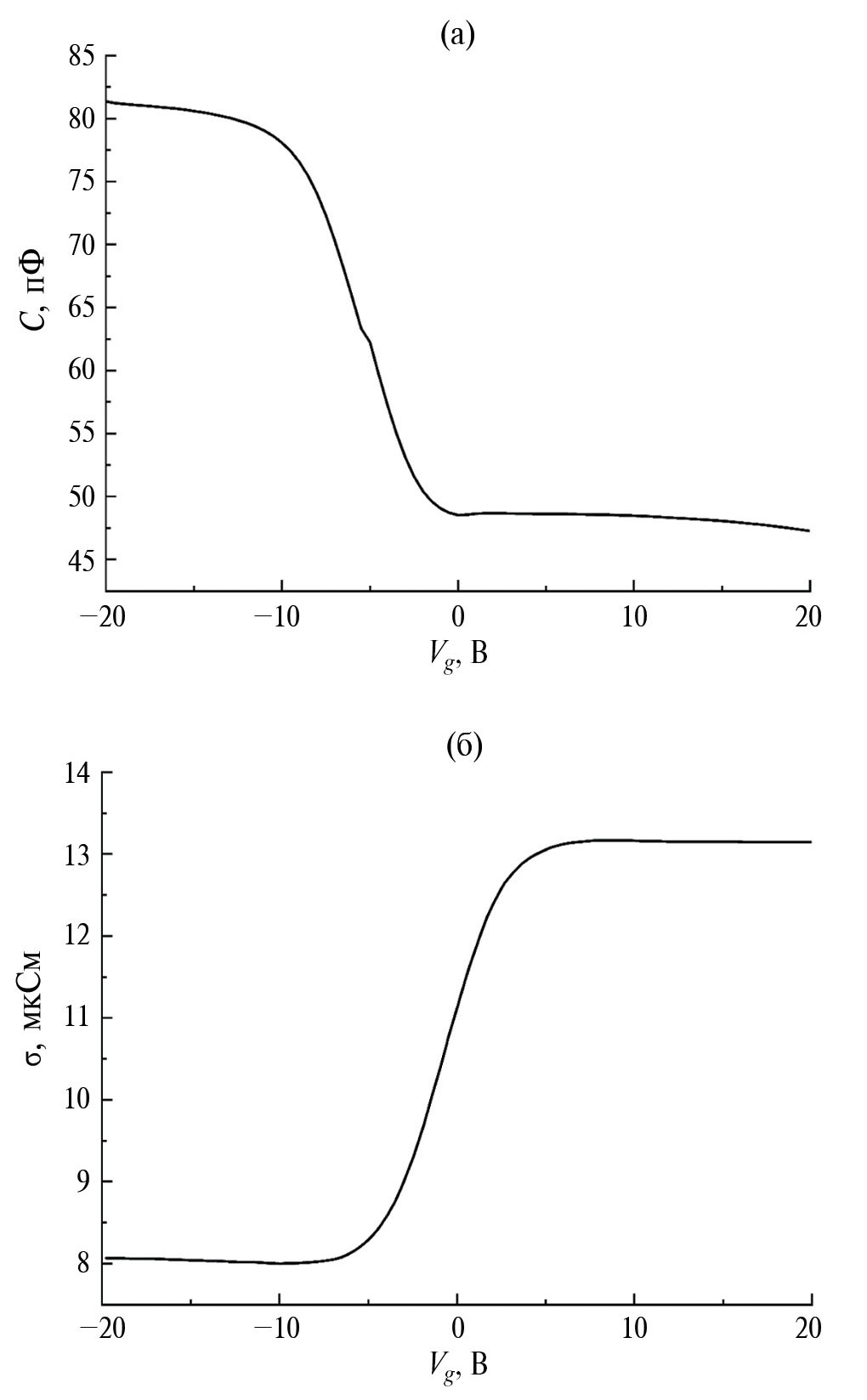 Так же как и в случае экранирования проникновения внешнего поля в полупроводник за счет перезарядки электронных ловушек в буферном слое на контакте с кремнием [5–7], в нашей структуре наличие на ВФХ двух плато не свидетельствует о реализации режимов глубокого обеднения и сильного обогащения в полупроводнике. Проведенный в разд. 1 анализ показал, что в диапазоне напряжений, при которых проведены измерения высокочастотного импеданса, состояние подложки изменяется вблизи плоских зон. Поэтому изгиб зон в полупроводнике мал и его поверхность не переходит в состояния ни инверсии, ни глубокого обогащения. Наблюдаемые (рис. 2) переходы кривых C(Vg) и σ(Vg) при Vg → ±20 В в плато обусловлены реальной зависимостью проводимости слоя окисла кремния от полевого напряжения. Причем функция существенно не симметрична по отношению к полярности полевого напряжения — она в четыре раза уменьшается при переходе от отрицательных к положительным Vg. Высокая проводимость слоя SiO2 проявляется в аномально большой величине измеряемой емкости МДП-структуры, которая оказывается заметно больше емкости изолирующего промежутка.