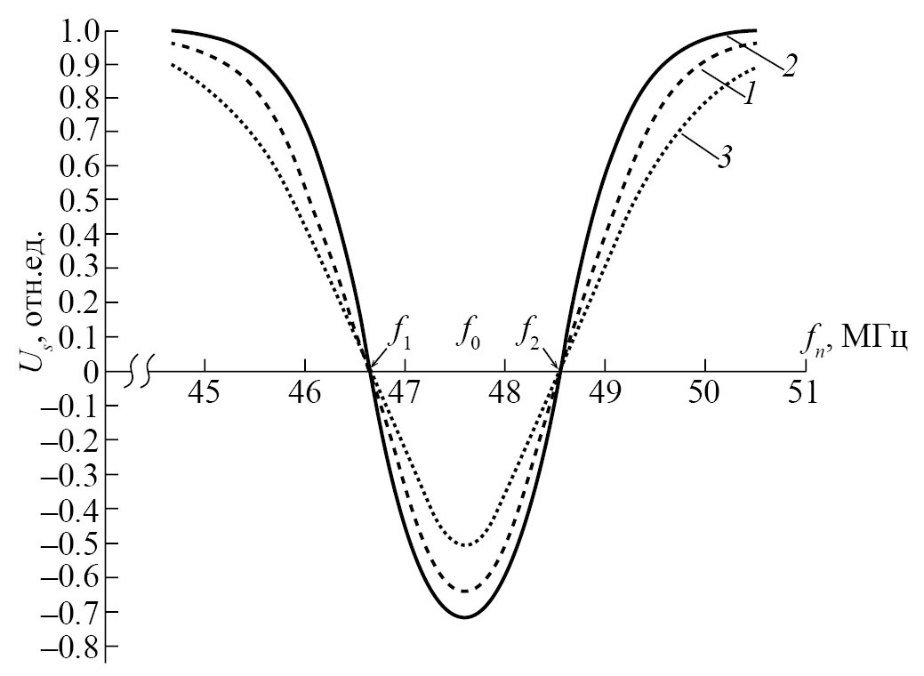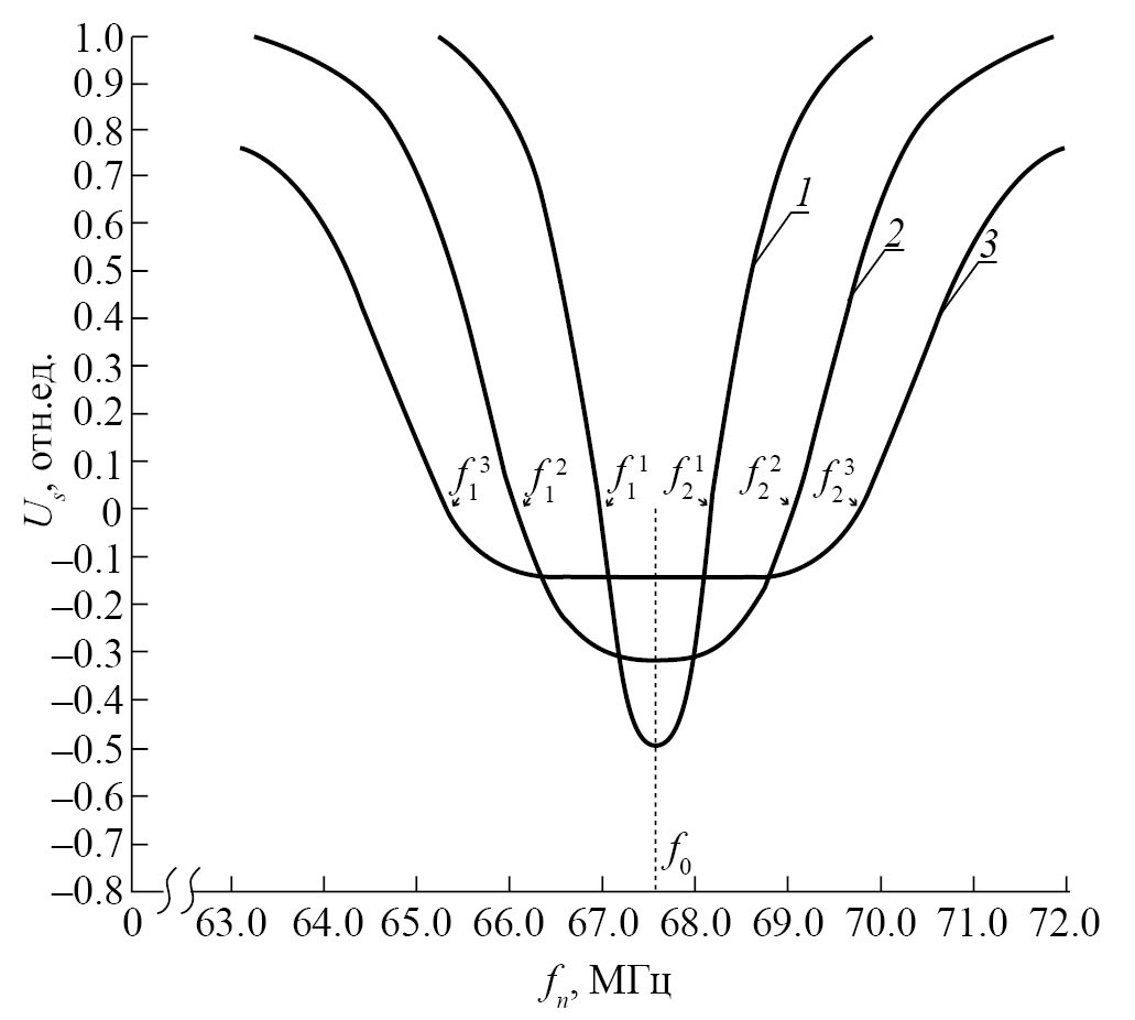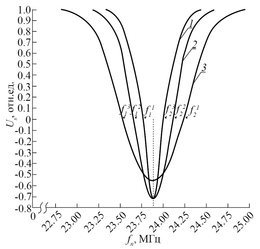 Рис. 1. Контур линии нутации на основе зависимости изменения амплитуды ЯМР-сигнала Us от fn для потока водопроводной воды при Т = 288.2 (1), 293.1 (2) и 308.6 (3); расход воды qопт = 2.59 мл/с; индукция поля В1 = 32.16 мкТл.