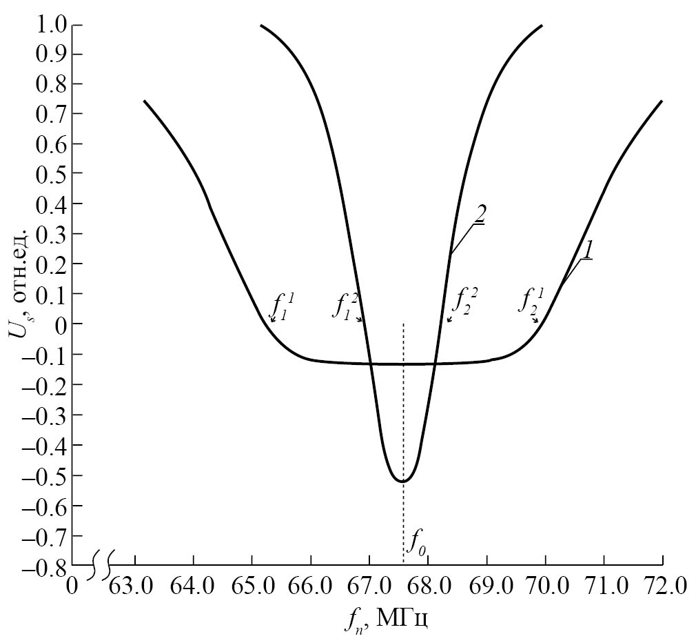 Особенностью управления контуром ЛН в разработанном лабораторном стенде является применение двух режимов управления величиной неоднородности ΔВ0. Реализованная особенность позволила получить два варианта ЛН для двух режимов формирования неоднородности магнитного поля в зоне размещения катушки нутации (рис. 5), которые представляют в дальнейшем интерес для измерения q. График 1 соответствует режиму формирования ΔВ0 с использованием регулировочных винтов 5 и специальных изготовленных коррекционных катушек 7 (неоднородность магнитного поля в хоне расположения катушки нутации выставлена на максимум). График 2 (см. рис. 5) соответствует преобразованию структуры ЛН при отключении катушек 7.