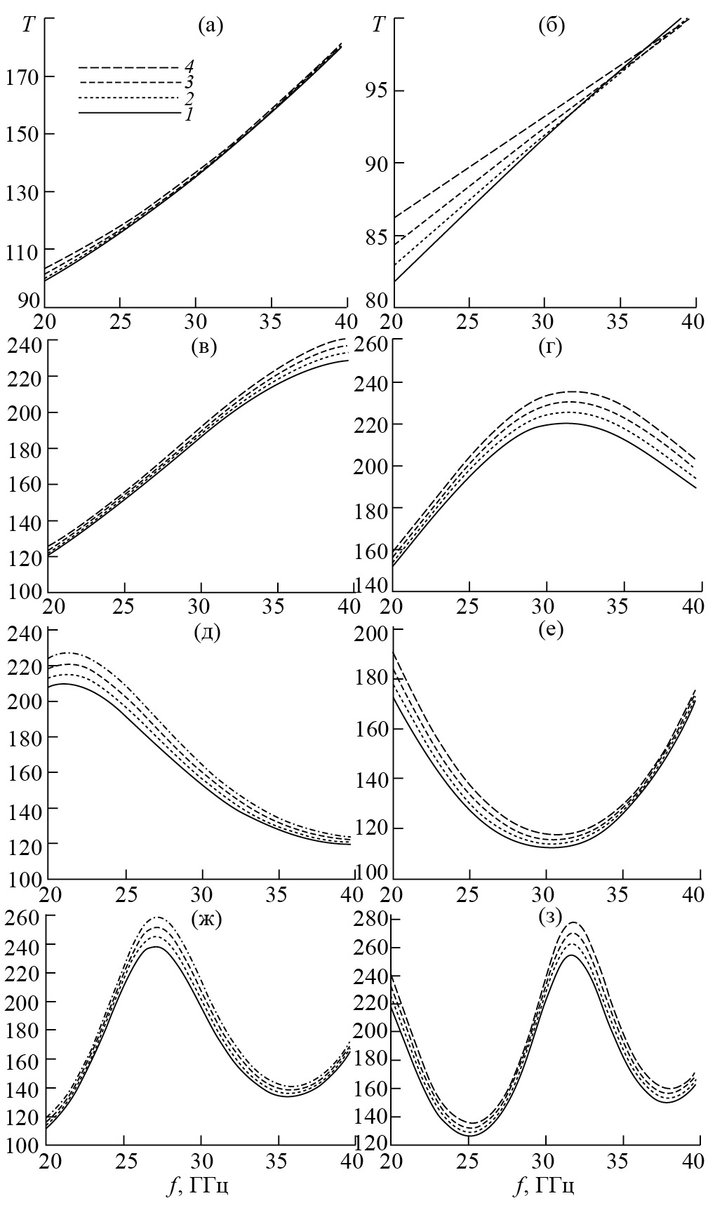 Рис. 2. Спектры радиояркостной температуры собственного излучения плоского слоя нефти на воде при h = 0 (а), 1 (б), 1.5 (в), 2 (г), 3 (д), 4 (е), 7 (ж) и 10 мм (з) и при Т0 = 273 (1), 283 (2), 293 (3) и 303 К (4); поляризация горизонтальная, угол излучения 50°.
