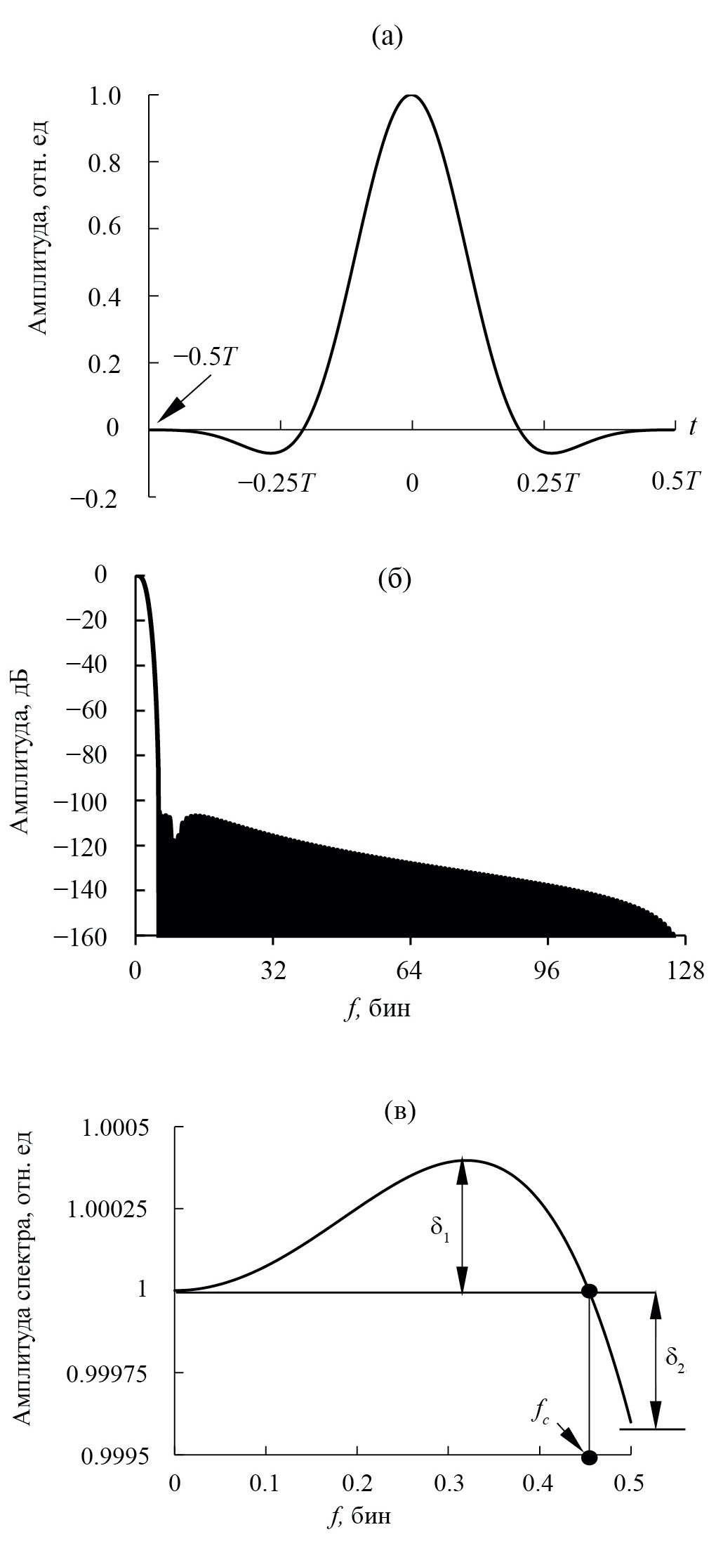 На рис. 1 показана характерная весовая функция с плоской вершиной, полученная по описанному методу. Для рисунка использована оптимальная косинус-полиномиальная весовая функция со следующими параметрами: порядок m = 4, отрезок оптимизации Ω = [β, 0.5N], β = 5.5, скорость спада боковых лепестков V = 12 дБ/окт, число выборок для рисунка выбрано равным N = 256. В результате синтеза получены следующие характеристики: ошибка на интервале уплощения δ = 0.04%, уровень максимального бокового лепестка P = –106.6 дБ. Рис. 1а иллюстрирует вид функции во временной области. Характерной чертой функций с плоской вершиной является наличие областей с отрицательным значением функции, что является необычным для классических весовых функций [1, 2]. На рис. 1б приведен спектр функции в положительной части спектра, при отрицательных частотах спектр отображается зеркально; на рис. 1в представлен в крупном масштабе спектр на отрезке уплощения бин, показаны также введенные выше параметры δ1, δ2, fc.
