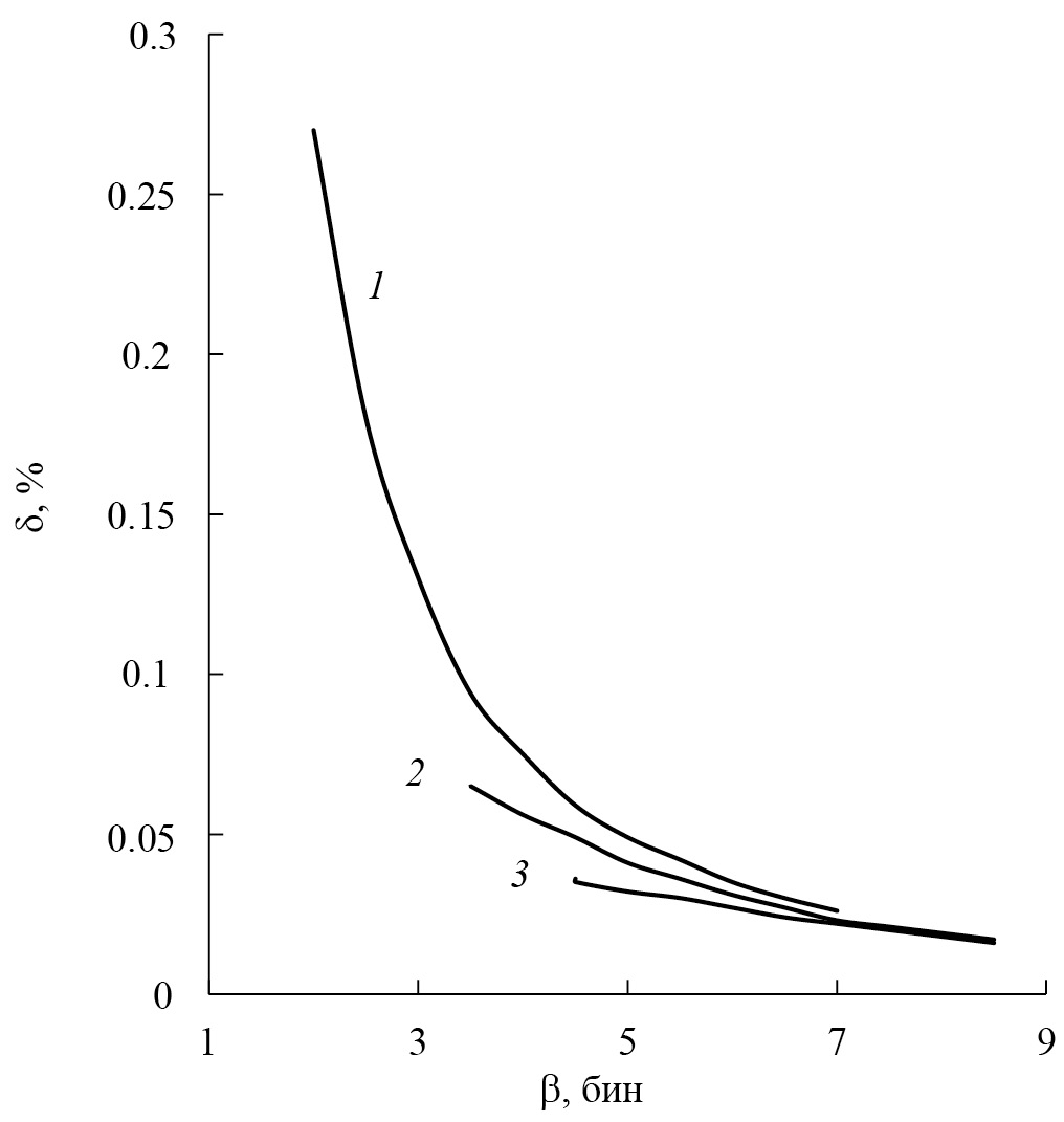 Рис. 2. Зависимость ошибки δ на интервале уплощения от параметра синтеза β для оптимальных косинус-полиномиальных функций со скоростями спада боковых лепестков 6 (1), 24 (2) и 36 дБ/окт (3).