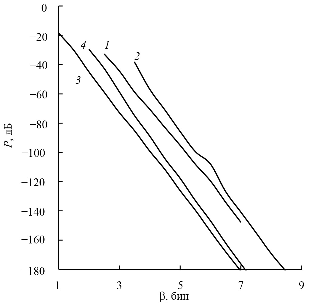 Рис. 3. Зависимости уровней максимальных боковых лепестков на отрезке [β, N / 2] бин от параметра β для оптимальных весовых функций с плоской вершиной (1, 2) и без этого свойства (3, 4) для скоростей спада боковых лепестков 6 (1, 3) и 24 дБ/окт (2, 4).