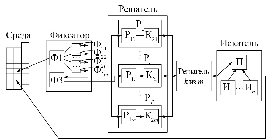 Решатель имеет m блоков Pi, каждый из которых состоит из блоков P1i – анализатора и блока вторичного критерия K2i (i = 1, m). Эти блоки для каждого канала совместно определяют шумовой или аномальный характер сигналов среди “подозрительных” элементов региона [4, 5, 7, 8, 14].