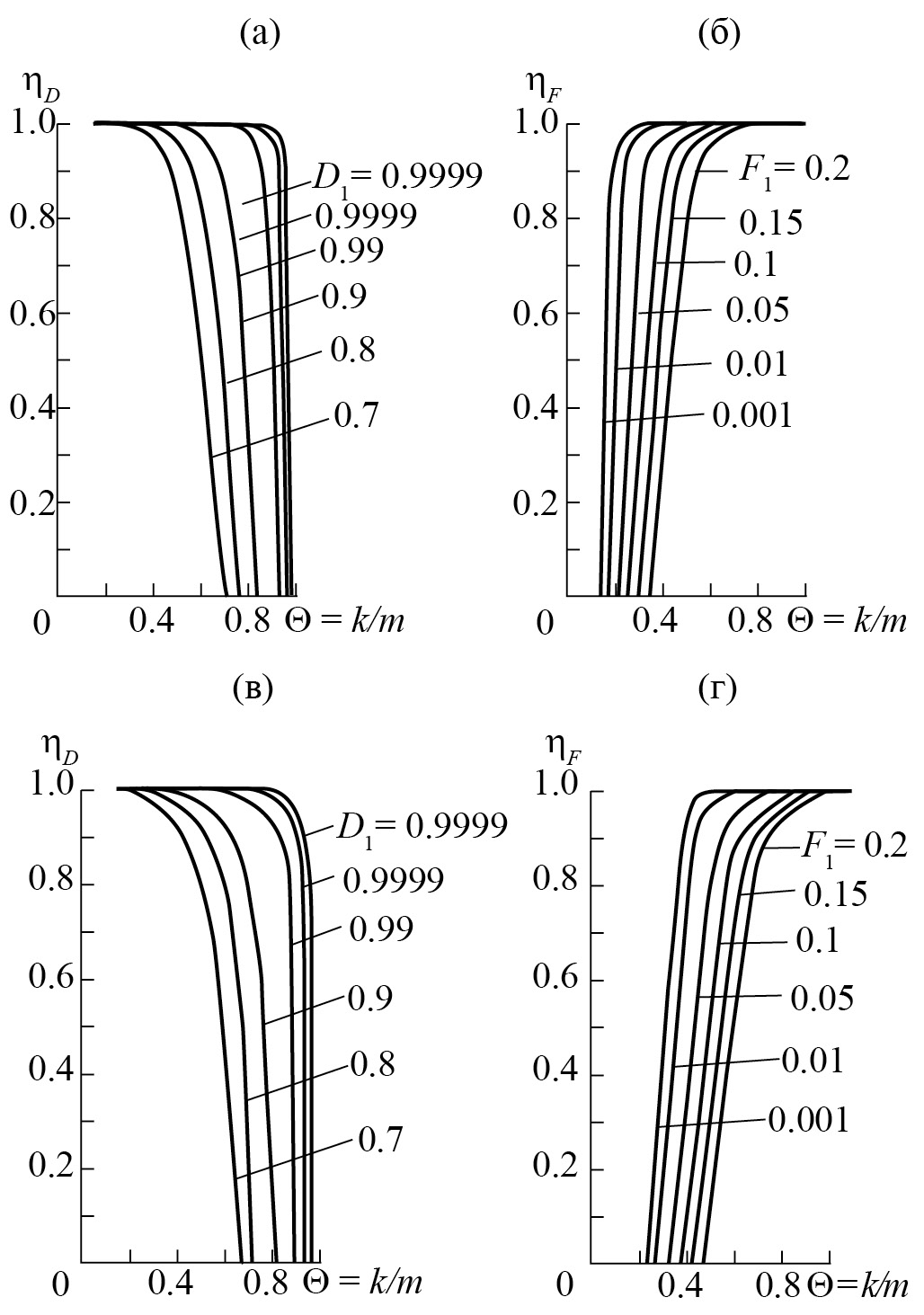 На рис. 2а, 2б, 2в и 2г представлены зависимости ηD и ηF от θ = k / m для случая, когда m = 5, 10, D1 = 0.7, 0.8, 0.9, 0.99, 0.999, 0.9999 и F1 = 0.2, 0.15, 0.1, 0.05, 0.01, 0.001. Видно, что эффективность при m = 10 больше, чем при m = 5. С ростом k относительная эффективность ηD падает, а ηF – растет; с ростом D1 эффективность растет, а с уменьшением F1 эффективность ηF растет.
