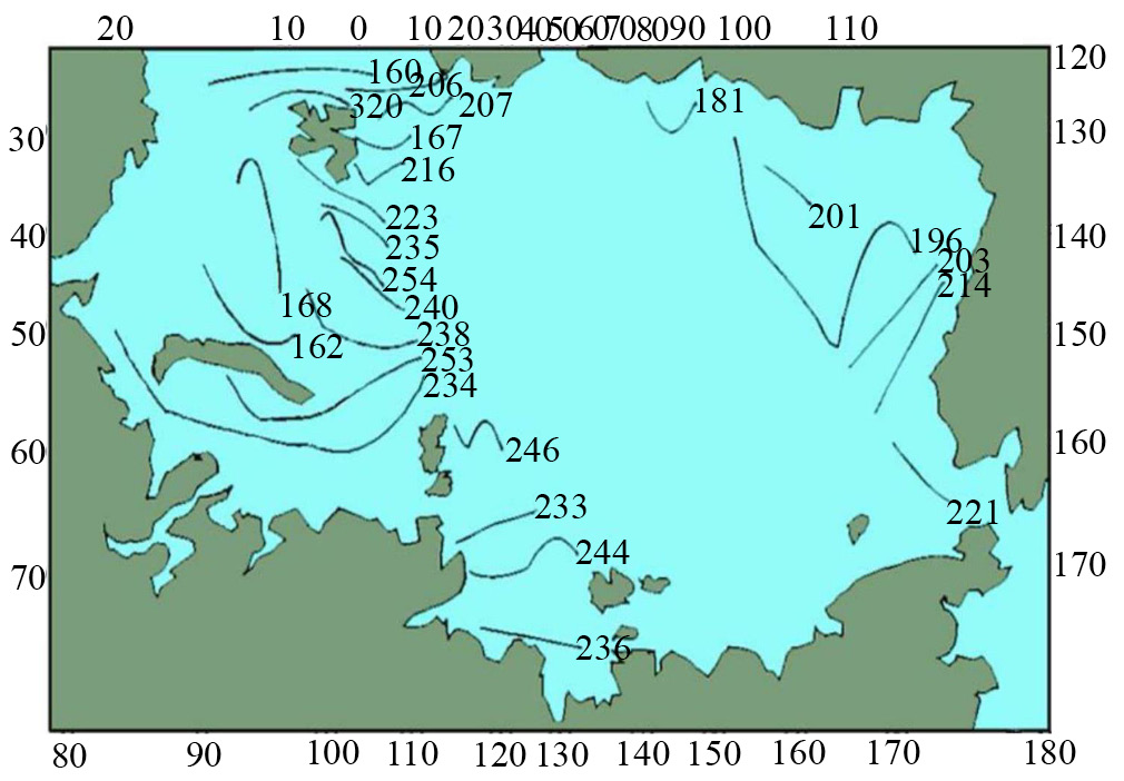 Как видно из рис. 3, в Карском море и море Лаптевых в феврале 1984 г. преобладал однолетний лед. Вариации радиояркостной температуры в море Лаптевых объясняются изменением сплоченности ледяного покрова. Меридиональное распределение изотерм в Карском и Баренцевом морях связано с распределением течений. Уменьшение радиояркостной температуры северо-западнее острова Шпицбергена до 205…207 К объясняется мощными выносами многолетнего льда в Гренландское море.
