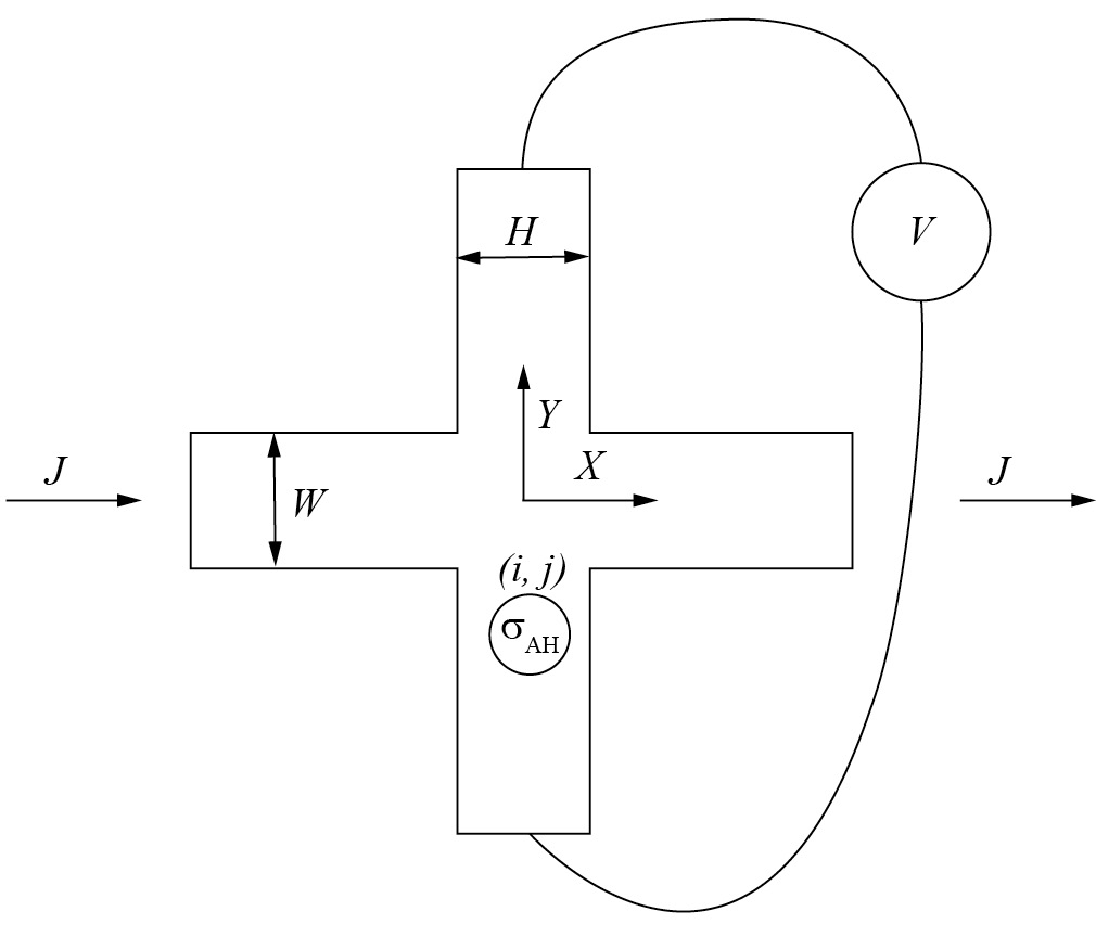 Величина продольной проводимости σ0 указывает, является ли ячейка проводящей или изолирующей, а величина аномальной холловской проводимости σAH — намагниченной или нет. Поскольку токи и напряжения в соседних ячейках влияют друг на друга, расчет проводился итеративно. На рис. 1 показана схема моделируемого креста, в котором сформирован домен с намагниченностью (выражаемой в аномальной холловской проводимости σAH), отличной от намагниченности остальной пленки.