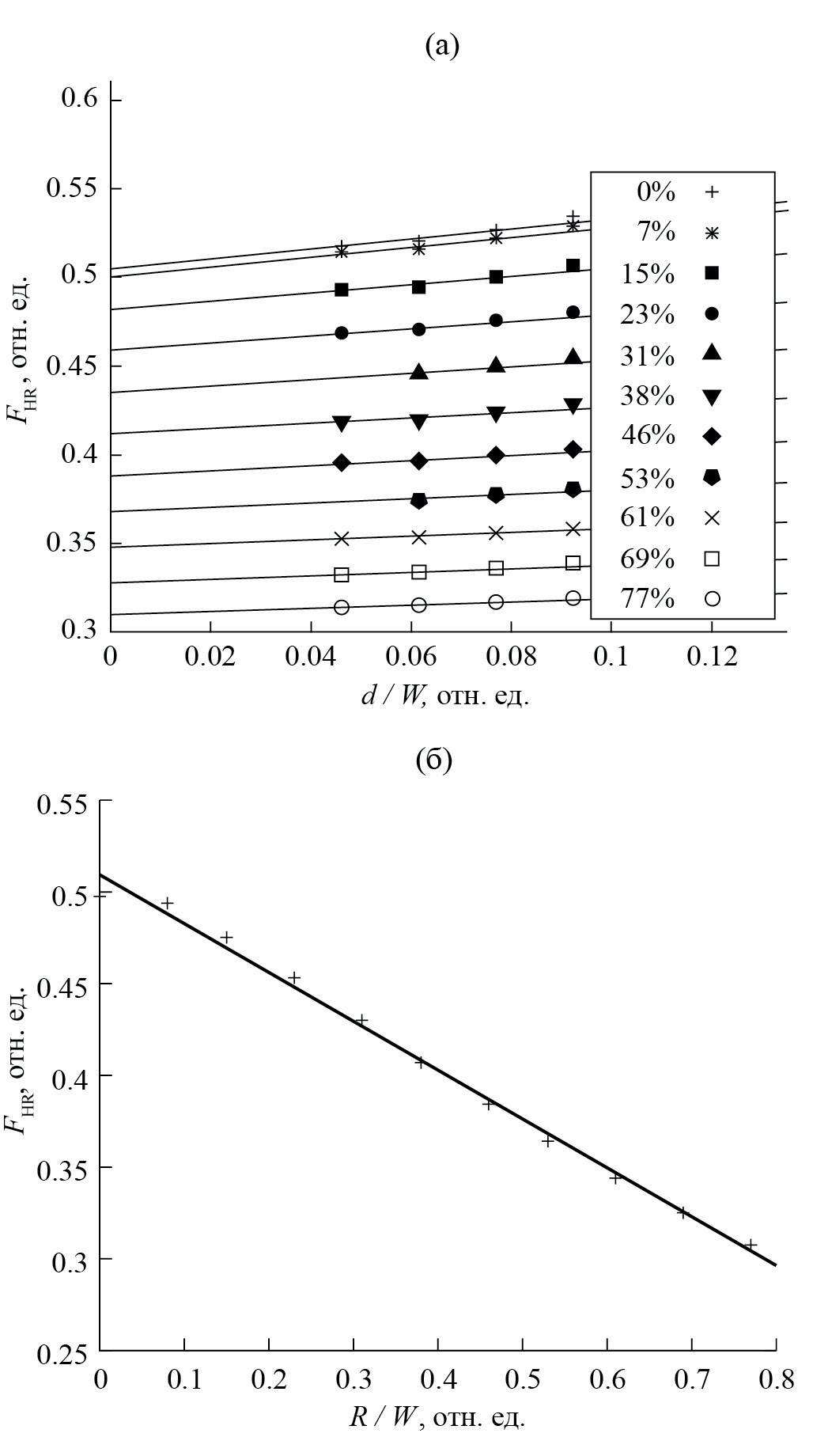 При изготовлении реальных образцов не всегда возможно сделать углы креста идеально ровными, часто они имеют скругления. И, разумеется, это сказывается на величине холловского отклика. Кроме того, в рассматриваемой нами модели присутствуют немагнитные области. Для того чтобы определить вклад обоих этих факторов, был проведен ряд расчетов. На рис. 3а показаны зависимости функции отклика в центре креста F0 для образцов с разными отношениями радиуса скругления R к ширине токовых контактов W и разной шириной немагнитного слоя по периметру, которая характеризуется отношением количества немагнитных ячеек d к ширине токовых контактов.