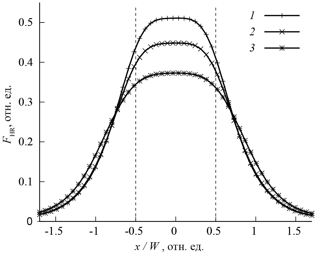 Рис. 4. Профили холловского отклика вдоль середины токовых контактов для различных отношений радиуса скругления к ширине канала: 0 (1), 23 (2) и 51% (3).