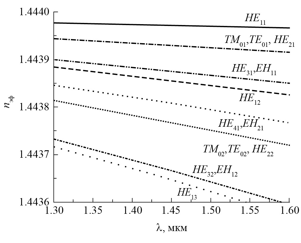 Приведенное уравнение было решено численно в программной среде Matlab, что позволило получить зависимость nэф от длины волны λ для различных мод волокна. Для заданного значения азимутального числа существует конечное число корней уравнения (1), нумерация которых задается индексом m. Значение этого индекса задает число экстремумов в распределении поля вдоль радиуса. Рассчитанные дисперсионные зависимости представлены на рис. 1.