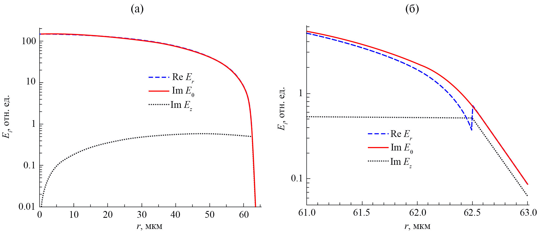 Видно, что амплитуды поперечных компонент Er и Eθ спадают по мере приближения к границе оболочки r = 62.5 мкм. Внутри оболочки эти две компоненты практически совпадают. На границе оболочки компонента Er увеличивается скачком до значения Eθ, в то время как переход Eθ через границу оболочки переходит непрерывно, что соответствует стандартным граничным условиям для тангенциальных и нормальных компонент. За границей оболочки спад компонент поля продолжается экспоненциально. В центре волокна продольная компонента Ez равна нулю. По мере приближения к границе оболочки она увеличивается до значений, сопоставимых со значениями поперечных полей, после чего экспоненциально спадает за границей оболочки. Для левоциркулярно поляризованных мод зависимости имеют аналогичный вид, но с противоположным знаком азимутальной компоненты.