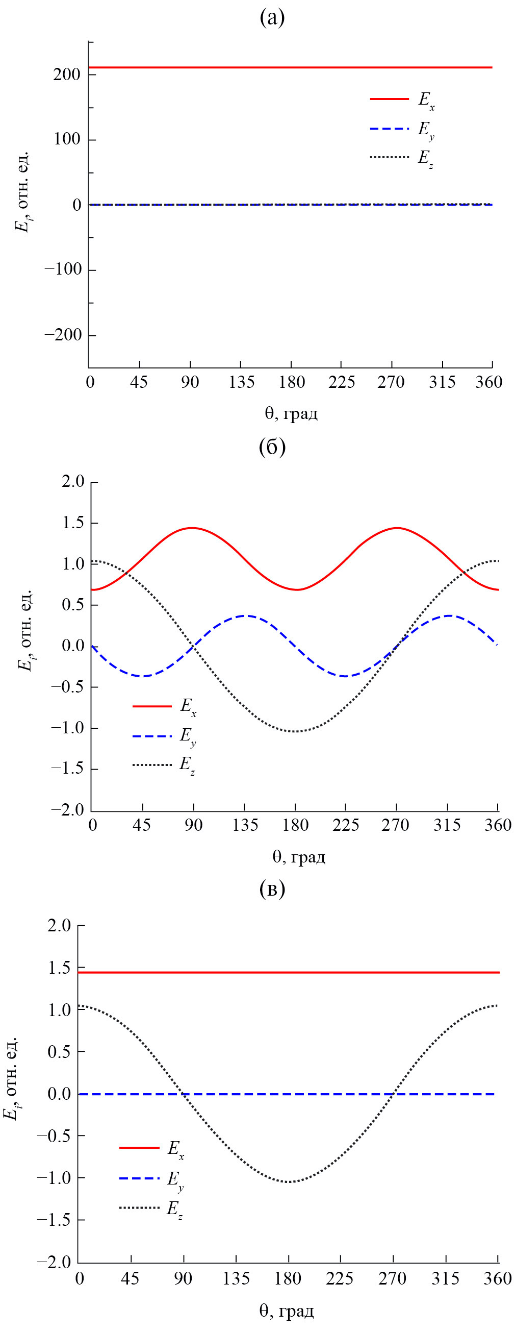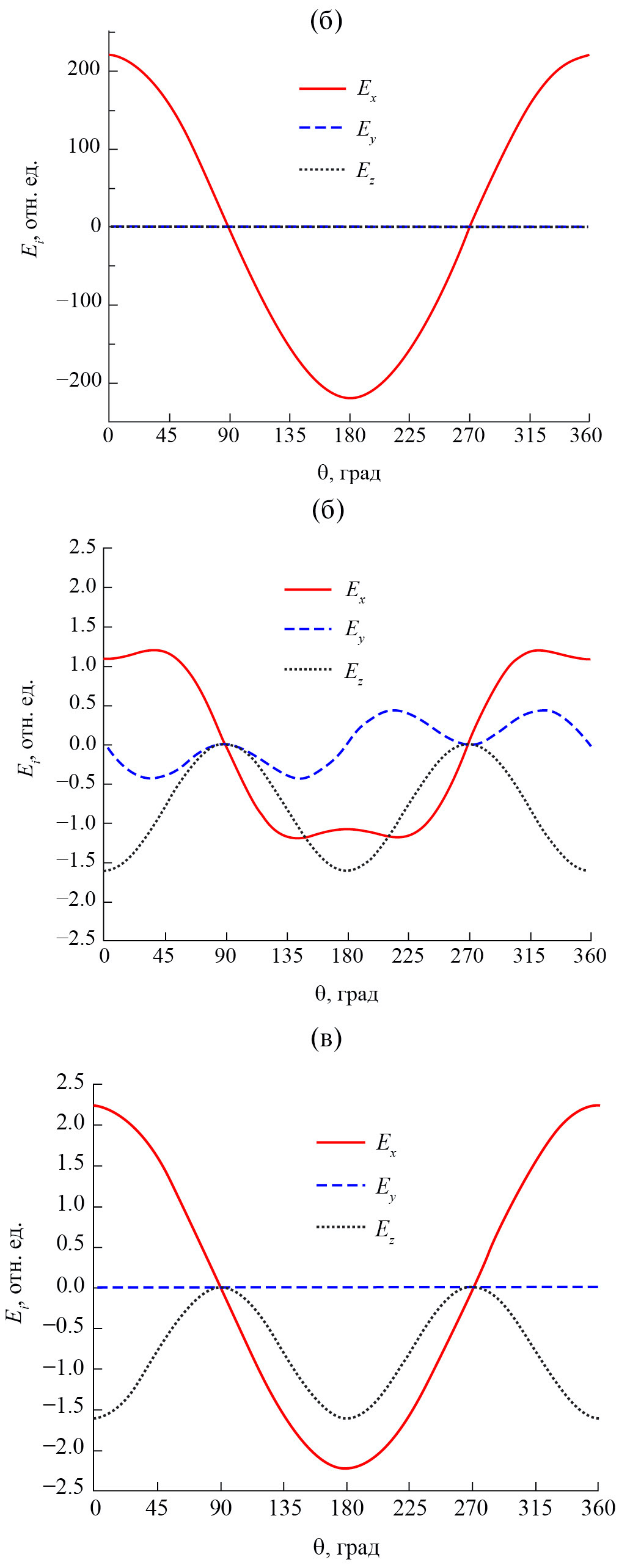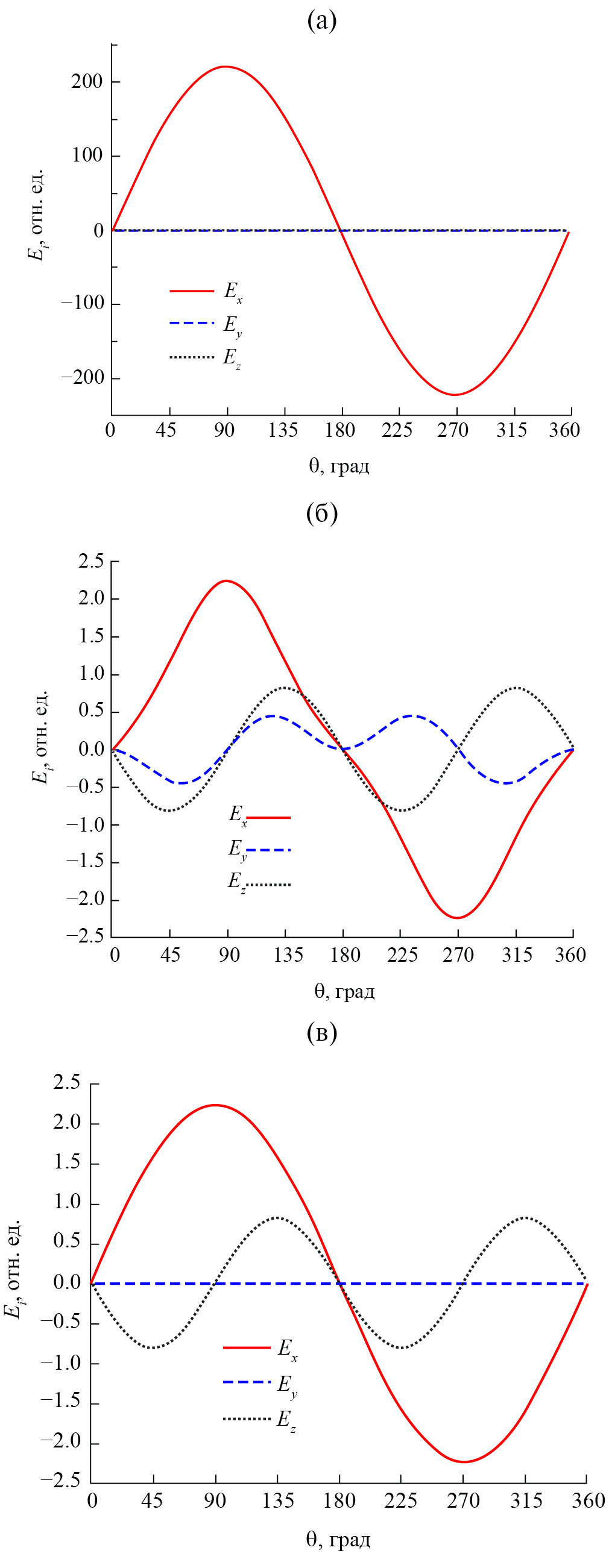 Рис. 4. Угловые зависимости компонент электрического поля LP01-подобной моды: внутри волокна для r = 30 мкм (а), под поверхностью (б) и над поверхностью оболочки волокна (в).