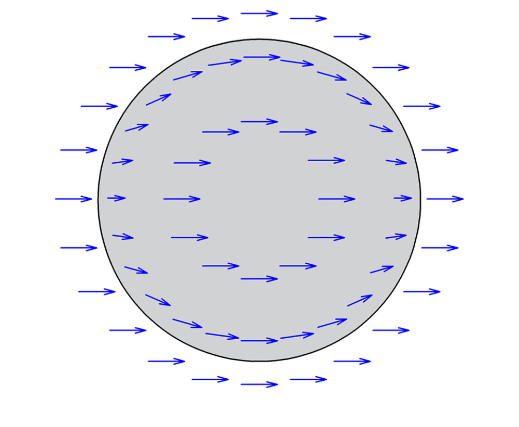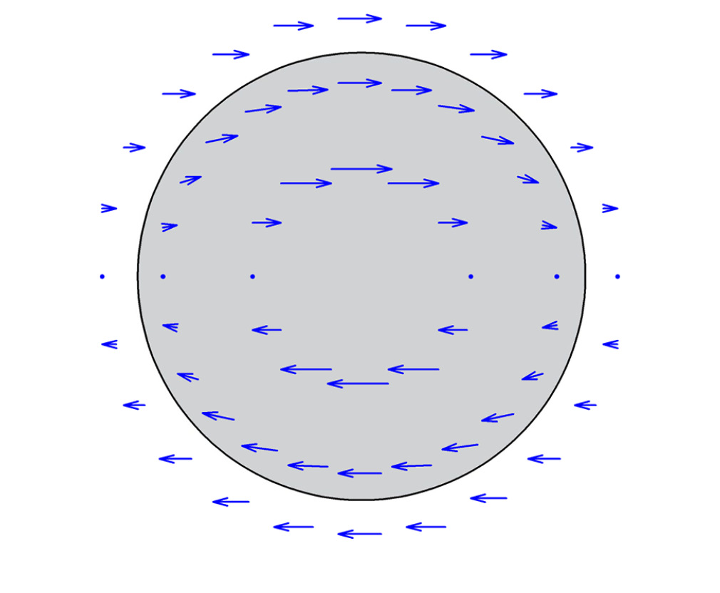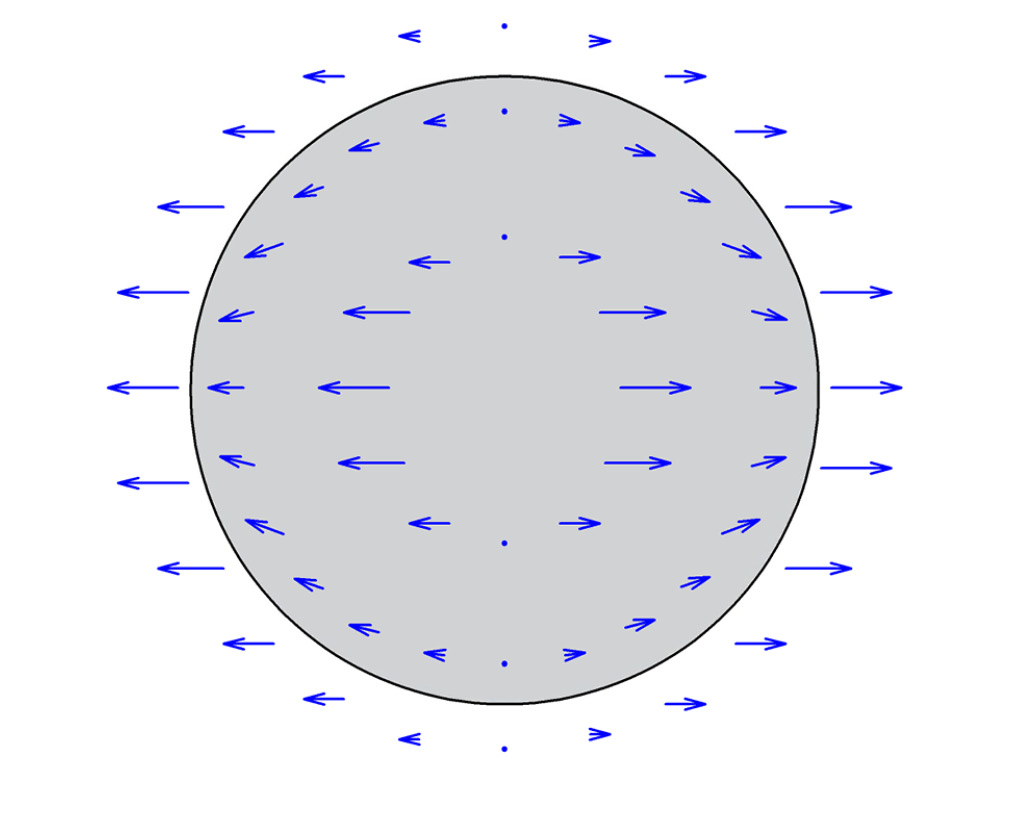 Используя угловые зависимости, представленные на рис. 4, было построено распределение векторов поперечного поля внутри и около поверхности волокна (рис. 5).