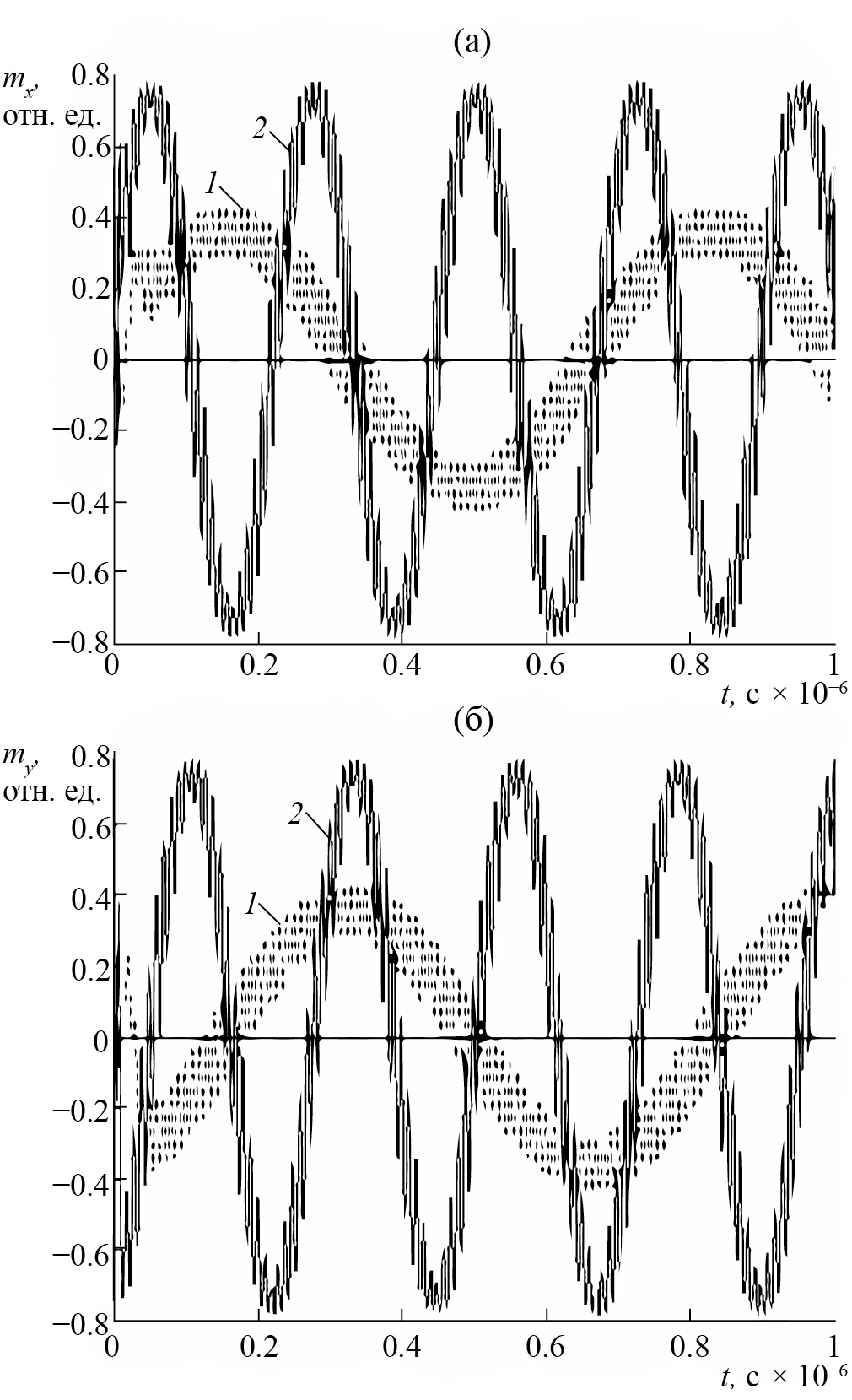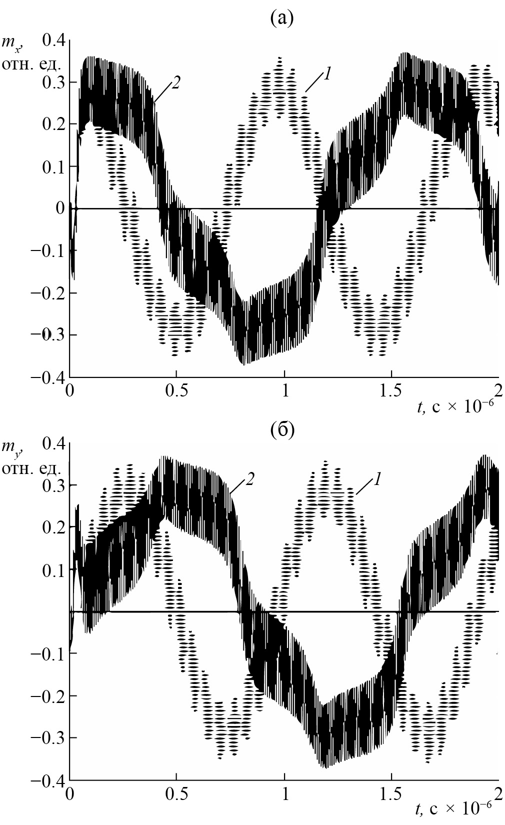 Развертки колебаний по времени показаны на рис. 3а (mx) и рис. 3б (my). На этих рисунках рассмотрены два крайних случая: первый при наличии анизотропии обоих порядков (кривые 1), второй – когда оба вида анизотропии отсутствуют (кривые 2).