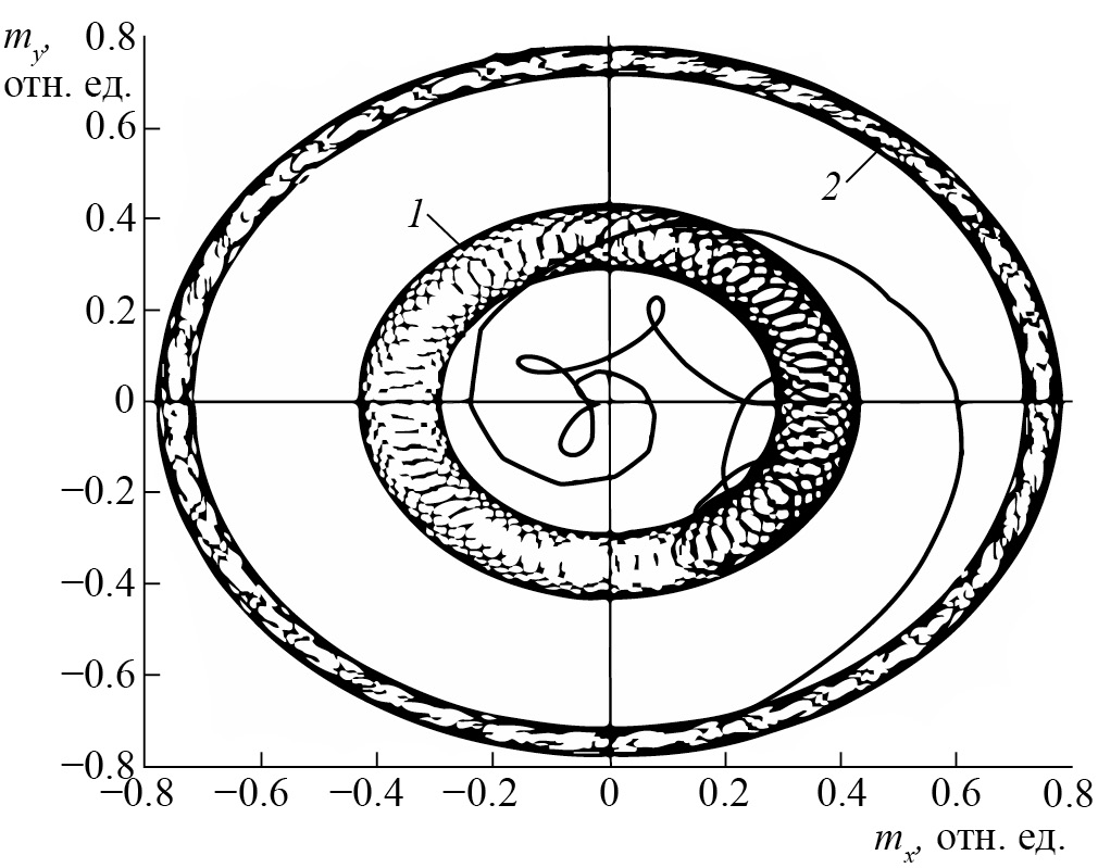 Рис. 4. Прецессионные портреты колебаний намагниченности при различных видах анизотропии: кривая 1 – K2 ≠ 0, K4 ≠ 0; кривая 2 – K2 = 0, K4 = 0.