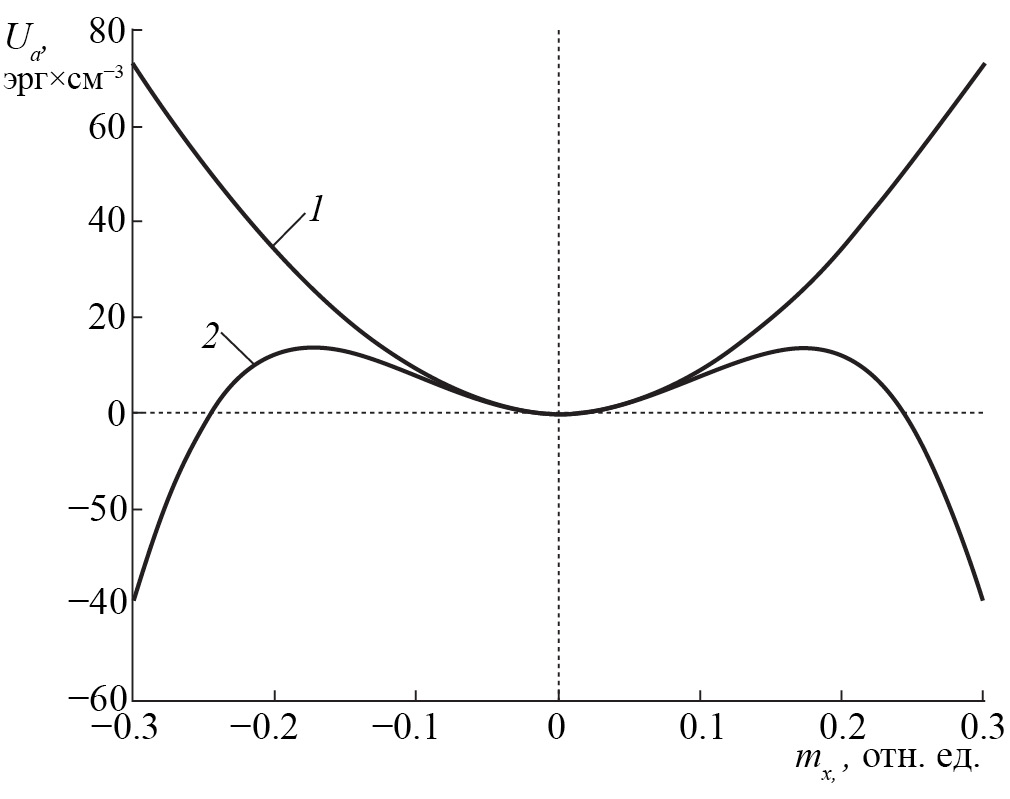 Как видим, оба слагаемых представляют собой параболы, ветви которых при увеличении mx неограниченно возрастают (во всяком случае до mx → 1). Если обе константы положительны, то потенциал Ua имеет единственный минимум, соответствующий mx = 0, т. е. намагниченность в равновесии будет выстроена точно вдоль оси Oz. Однако если константа K4 положительна, а K2 отрицательна, то слагаемые потенциала действуют в противоположных направлениях, так что возможно существование двух минимумов, разделенных максимумом. Такая ситуация представлена на рис. 2, где кривая 1 соответствует второму слагаемому потенциала (7) с положительной константой K4, а кривая 2 – первому слагаемому (7) с отрицательной константой K2. Кривая 3 соответствует сумме первых двух, так что на ней четко наблюдаются два минимума, разделенные максимумом.