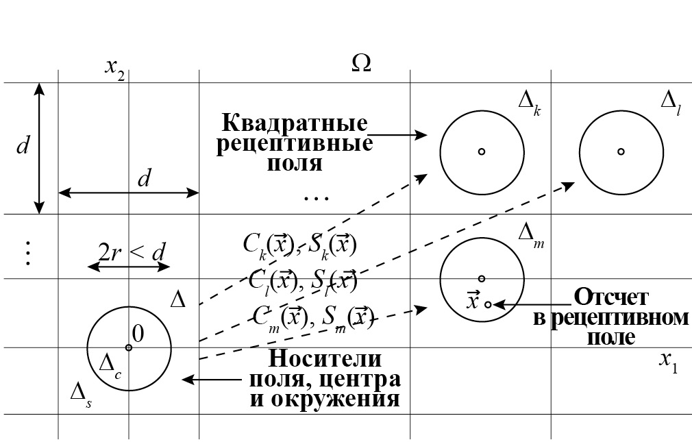 Предложенное выборочное представление наиболее точно описывает данные, полученные с рецепторов внешнего слоя сетчатки – палочек и колбочек. Эти данные генерируются при формировании изображений на основе регистрируемой интенсивности светового сигнала . Однако, как упоминалось ранее, посылаемые в кору головного мозга импульсы от нейронов внутреннего слоя сетчатки имеют существенное отличие от данных, зарегистрированных на фоторецепторных клетках. Благодаря многочисленным промежуточным интернейронам среднего и внутреннего слоев сетчатки, входной сигнал существенно преобразуется. В результате нейроны на выходе сетчатки передают агрегированные данные от десятков, а порой и тысяч фоторецепторов, расположенных в малых областях входного слоя сетчатки и образующих так называемые рецептивные поля (РП). Изучение систем РП и нейронного преобразования данных от входного слоя фоторецепторов в последовательность нейронных импульсов зрительного нерва обычно связывают с фундаментальными исследованиями Хьюбеля и Визеля [9]; современное представление строения зрительной системы и особенностях функционирования рецептивных полей можно найти, например, в [10].