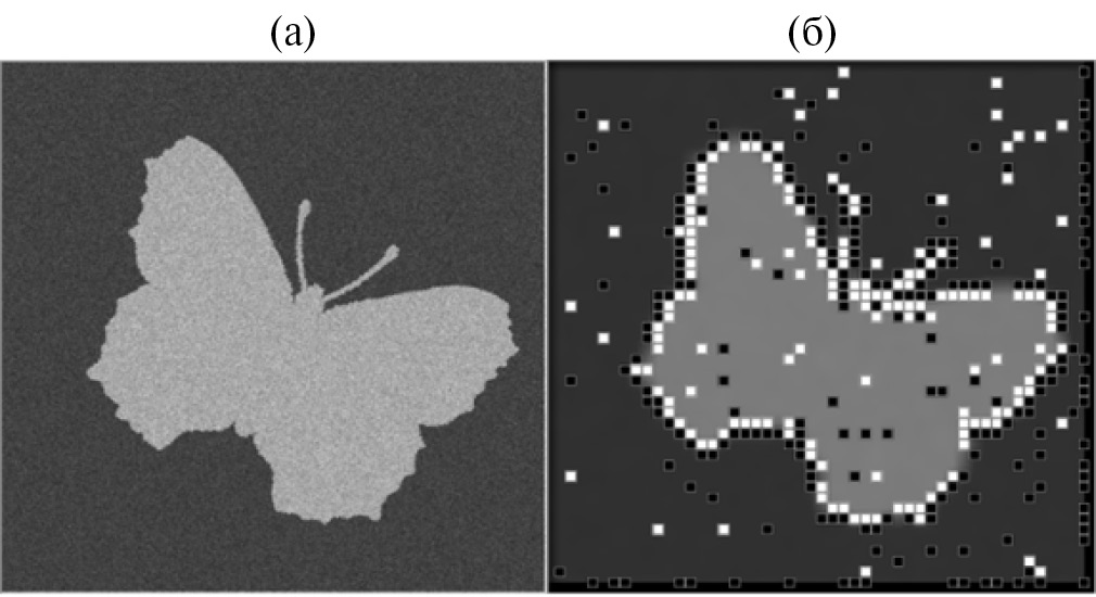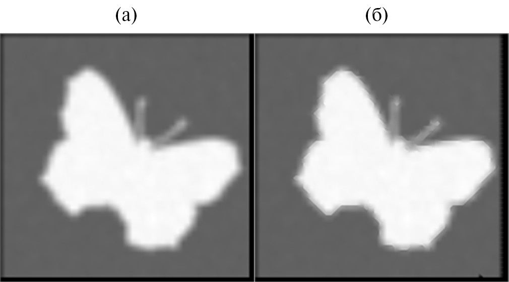 Для иллюстрации реконструкции (декодирования) изображений была использована простейшая билинейная, согласованная с границами интерполяция для кодированного выборочного представления «butterfly-19» (см. рис. 1б). Область представления Ω была покрыта набором из 2500 квадратных рецептивных полей, расположенных в узлах квадратной решетки 50×50 (см. рис. 2 и детали в [12]). В каждом k-м узле вычислялись значения {δk, nk}, после чего δk подвергалось цензуре с порогом . Классическая билинейная интерполяция, показанная на рис. 4а, демонстрирует реконструкцию на основе только части данных {nk}, интерполируя их сначала линейно вдоль вертикальных ребер решетки, а затем линейно по всем строкам всех ячеек на основе уже интерполированных значений вертикальных ребер. Билинейная интерполяция, направленная вдоль детектированных границ изображения, показана на рис. 4б. В отличие от классической билинейной интерполяции, она дополнительно оперирует значениями дефектов {δk}, которые представляют некоторое подобие оператора Лапласа. Если рассматривать величину дефекта δk подробно, то он представляет собой более общее значение, чем лапласиан, что позволяет использовать его подобно оператору Марра в задачах обнаружения границ. В таком случае билинейная интерполяция также использует двухпроходную реконструкцию. При первом проходе значения {nk} также интерполируются по всем вертикальным и горизонтальным ребрам решетки. Но в случае, когда в узлах данного ребра решетки значения δi и δj отличны от нуля и разных знаков, это ребро решетки рассматривается как пересекающее границу изображения, причем за точку пересечения принимается середина ребра решетки. В результате, если ребро решетки пересекается границей изображения, значения ni и nj в его узлах кусочно-постоянно продолжаются вдоль ребра решетки до встречи ровно посередине. Если же ребро не пересекает границу изображения, для него производится линейная интерполяция ni ↔ nj, как и в классическом случае. На втором проходе значения в ячейках решетки линейно интерполируются по значениям на их ребрах. Если ни одно ребро ячейки не пересекает границы изображения, или таких ребер одно или более двух, то интерполяция производится по строкам ячеек, как при классической интерполяции. Если же в ячейке имеется ровно два ребра решетки пересекающиxся с границами изображения, то, соединяя точки этих пересечений прямой линией, мы восстанавливаем фрагмент границы изображения в ячейке и проводим линейную интерполяцию по прямым, параллельным этой линии. Результат (см. рис. 4б) представляется обладающим лучшим визуальным качеством даже по сравнению с классической билинейной интерполяцией (см. рис. 4а).