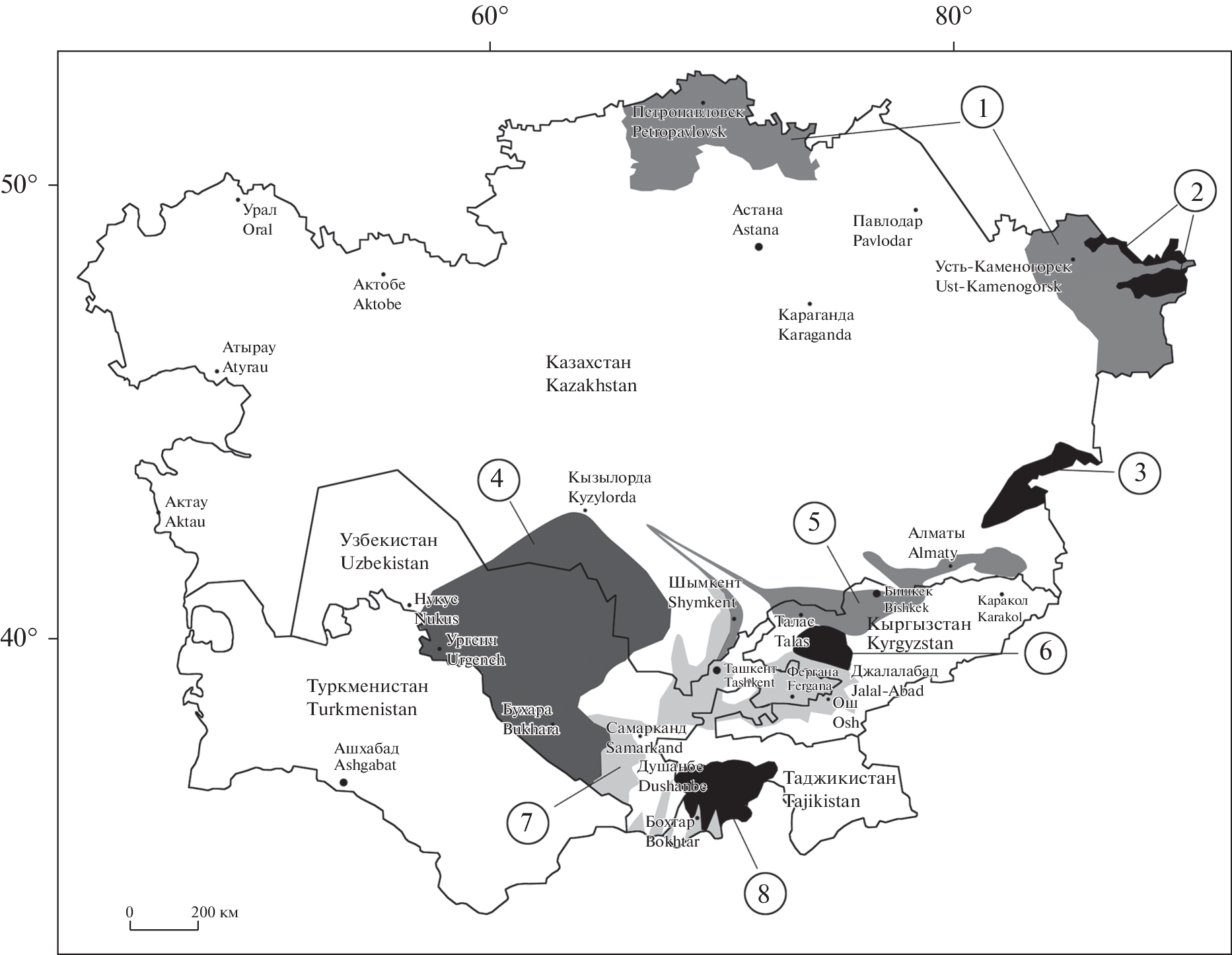 Проведено палинологическое исследование 82 проб среднеазиатского и казахстанского меда с целью определения ресурсов основных медоносных и безнектарных перганосных растений. Полученные результаты позволили установить 8 продуктивных зон пчеловодства на изучаемой территории. Выделенные зоны можно объединить в 2 большие группы: северную и южную, между которыми находится переходная полоса (зона 3, хребет Джунгарский Алатау), где получают меда со смешанными палинологическими характеристиками. В северной части (зоны 1 и 2, Северный и Восточный Казахстан) важными медоносами среди дикоросов являются Origanum vulgare L., Rubus idaeus L., виды рода Salix L., среди культурных растений – Helianthus annuus L., Sinapis alba L., среди безнектарных перганосов – Filipendula ulmaria (L.) Maxim. Южнее, (зоны 4–8; Южный и Юго-Восточный Казахстан, Кыргызстан, Таджикистан и Узбекистан), основными естественными медоносами являются виды родов Salvia L., Thymus L., Alhagi Tourn. ex Adans. и Tamarix L., Halimodendron halodendron (Pall.) C.K. Schneid., Psoralea drupacea Bunge, ценными медоносными с.-х. культурами – Gossypium hirsutum L., виды рода Onobrychis Mill., сорными медоносами – Echium vulgare L., Onopordum acanthium L., виды рода Sophora L., безнектарными перганосами – представители родов Hypericum L., Artemisia L., Plantago L. и семейства Chenopodiaceae.