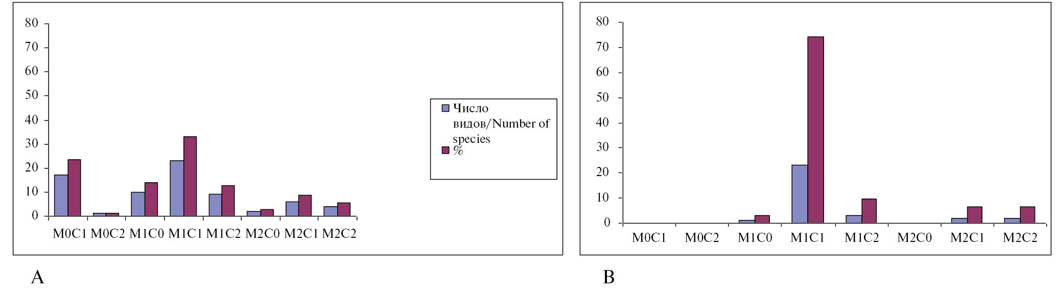 Fig. 2. The ratio of the surviving species of the parent (M) and self-seeded (C) specimens in the arboreta of the Dzhanybek Research Station on meadow-chestnut soils (A) and on the solonetzic complex (B).