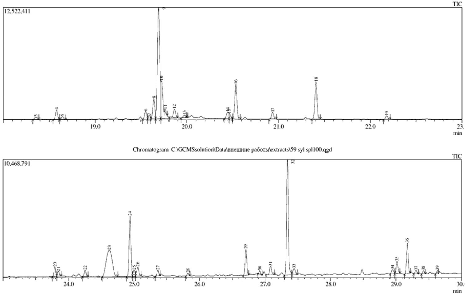 Идентификацию индивидуальных соединений спиртового и петролейного экстрактов коры проводили методом хромато-масс-спектрометрии с использованием газового хромато-масс-спектрометра GC-MS QP-2010 Ultra (Shimadzu, Япония). При подготовке проб к хромато-масс-спектрометрическому анализу предварительно проводили их дериватизацию силилирующим агентом BSTFA. Условия хроматографического анализа: колонка Rxi-5 Sil MS (длина колонки 30 м, внутренний диаметр 0.25 мм), изотермический режим при 50°C в течение трех минут, затем программированный подъем температуры со скоростью 10°C/мин до 320°C с выдержкой при конечной температуре 20 мин. Температура испарителя 230°C, температура ионизационной камеры 230°C, энергия ионизации 70 эВ. Идентификацию соединений осуществляли по библиотекам массспектров NIST 2011 и Wiley 2010 со степенью достоверности выше 80%.